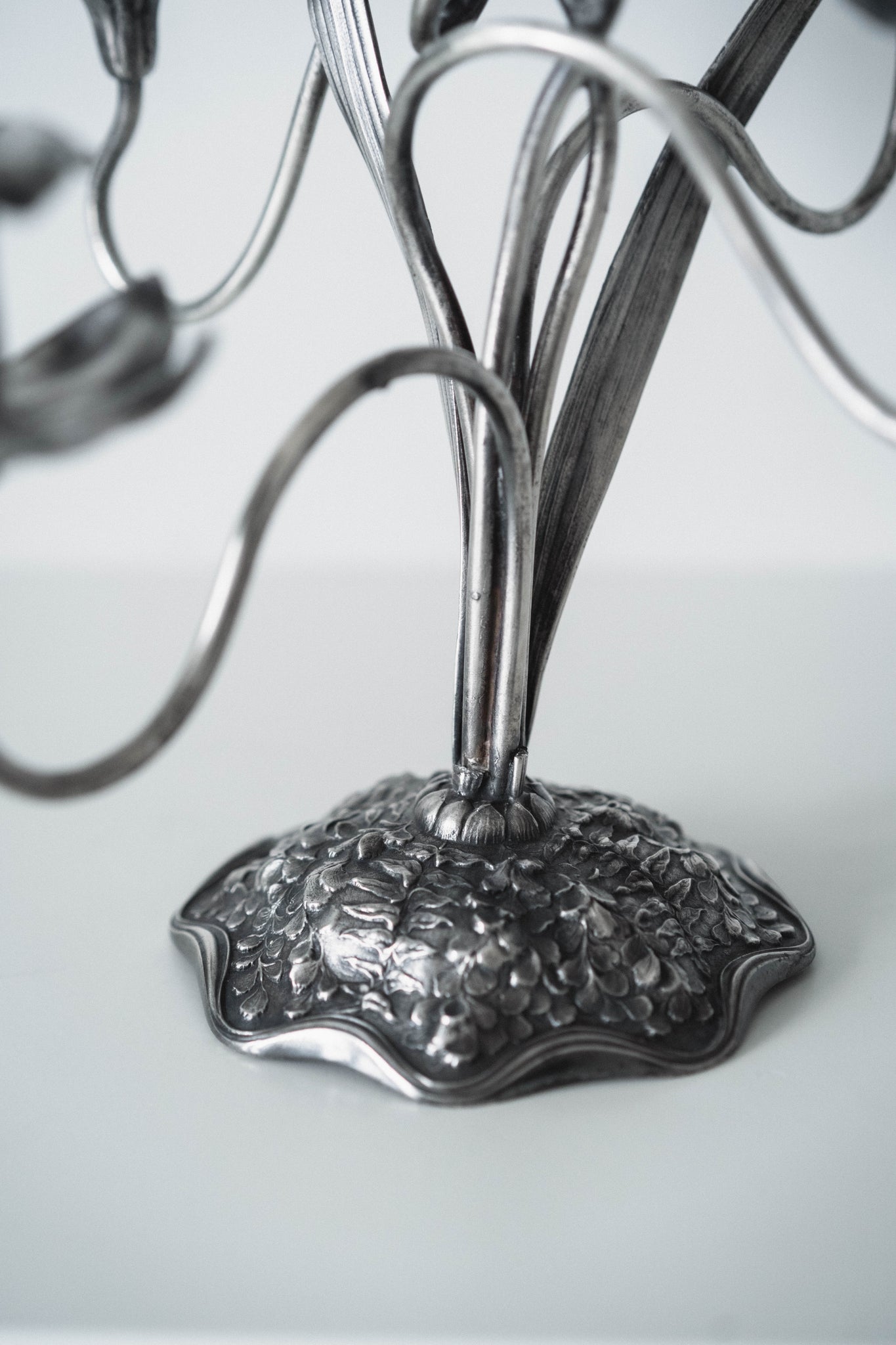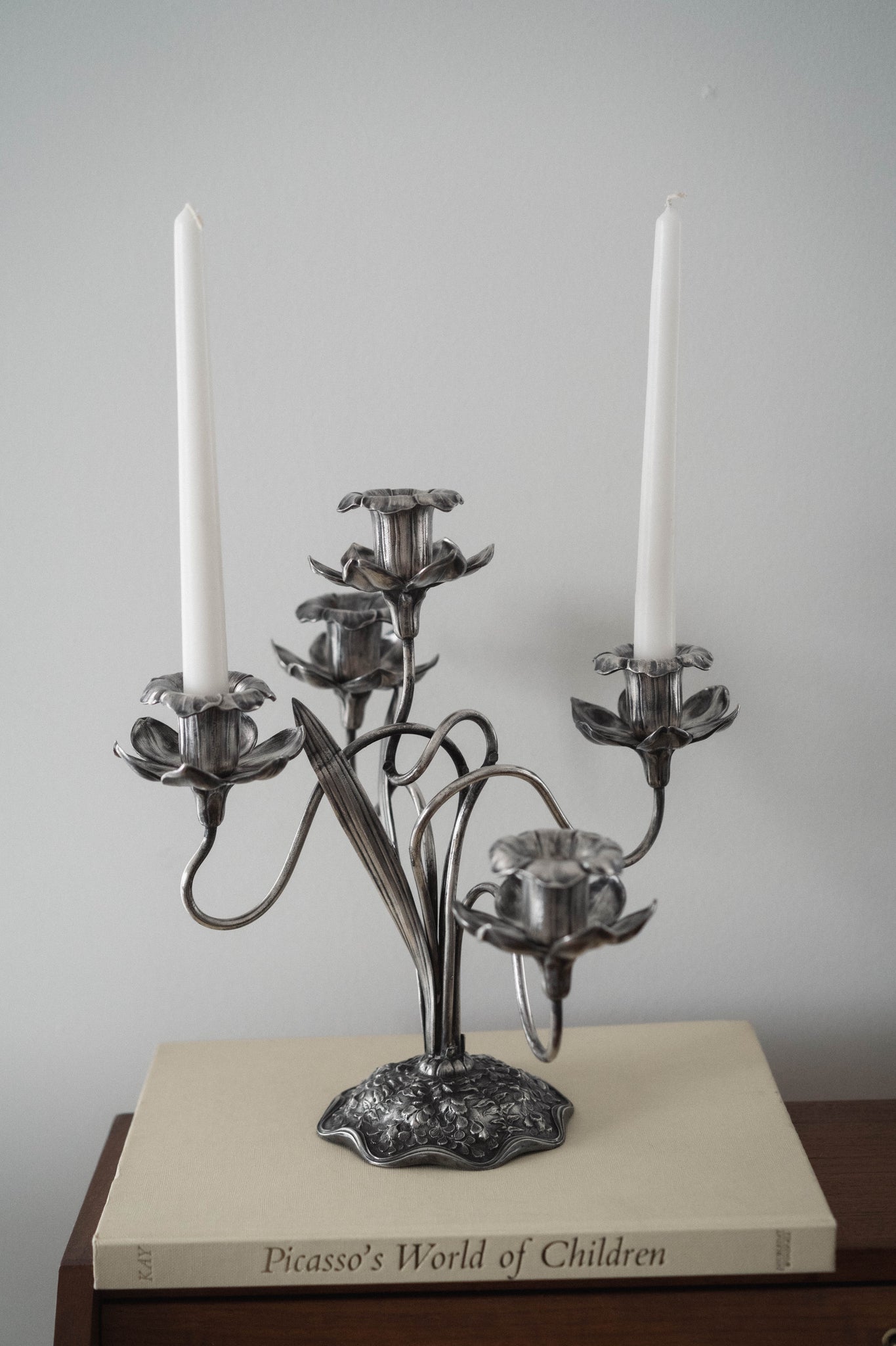 Antique art nouveau silver plated candelabra in the form of a lily. Stamped American Silverplate Co. Quadruple 626. Holds five candles. c1900s.