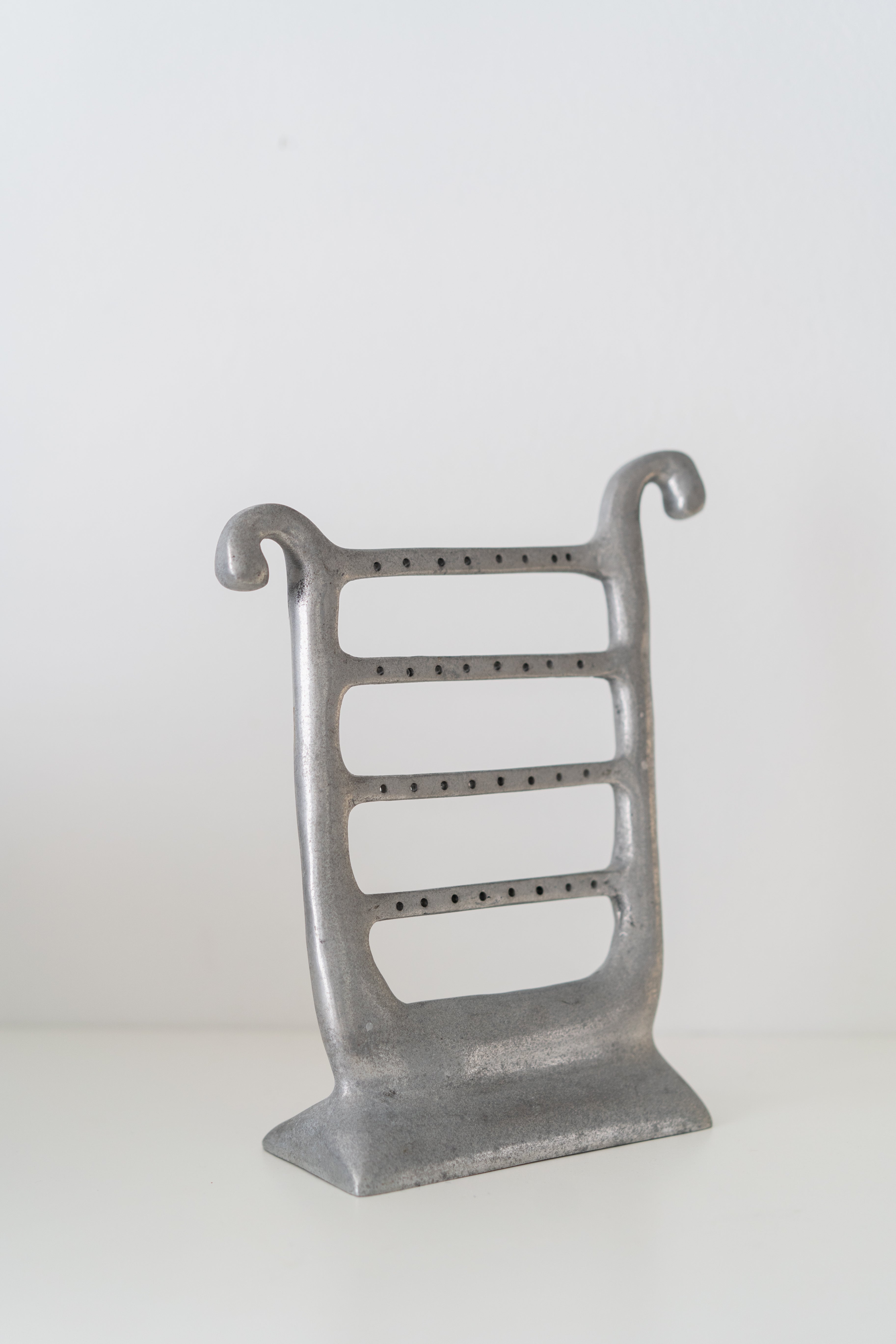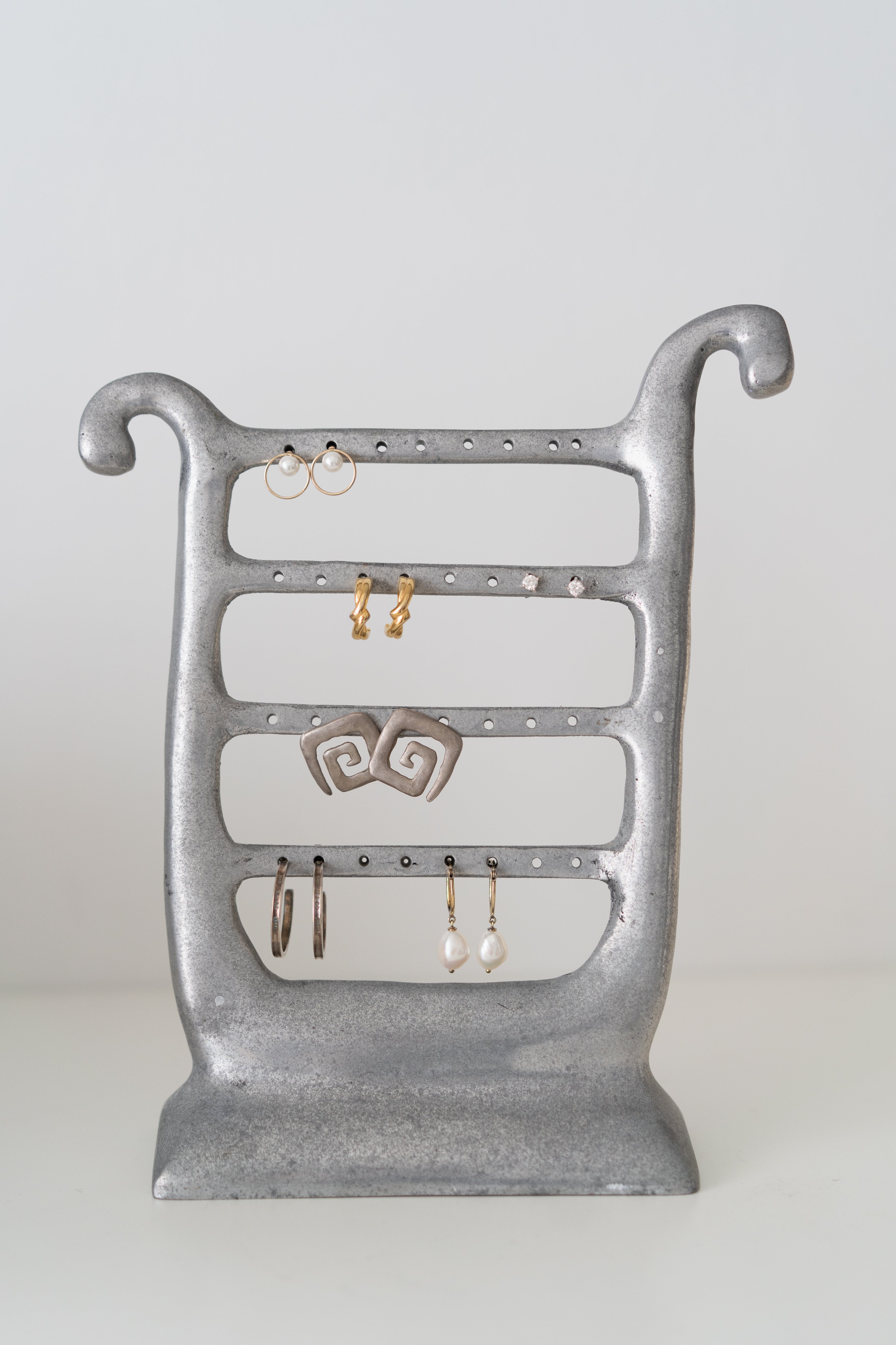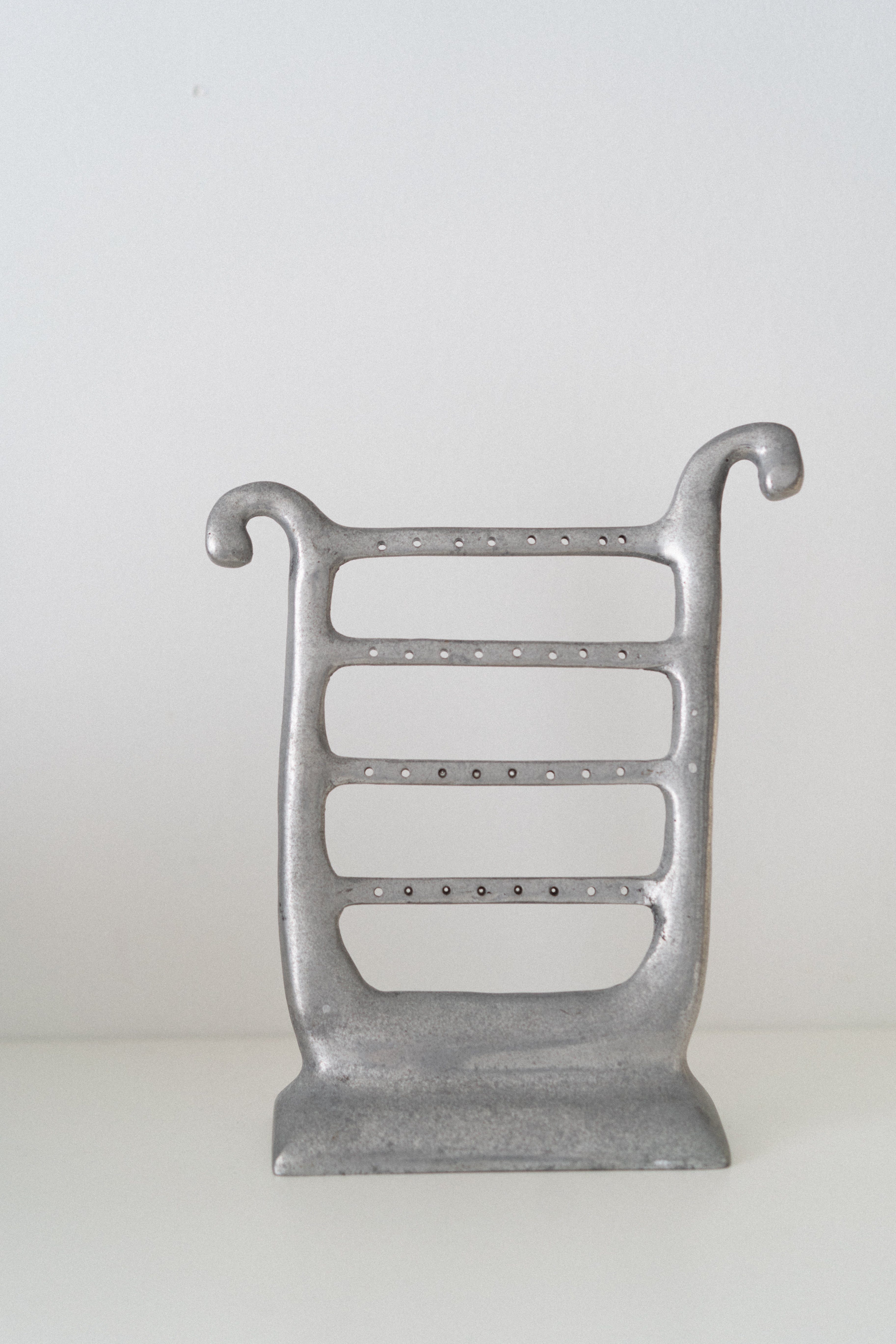 Aluminum earring holder in the shape of a harp. Features 4 rows. Holds 16 pairs of earrings.