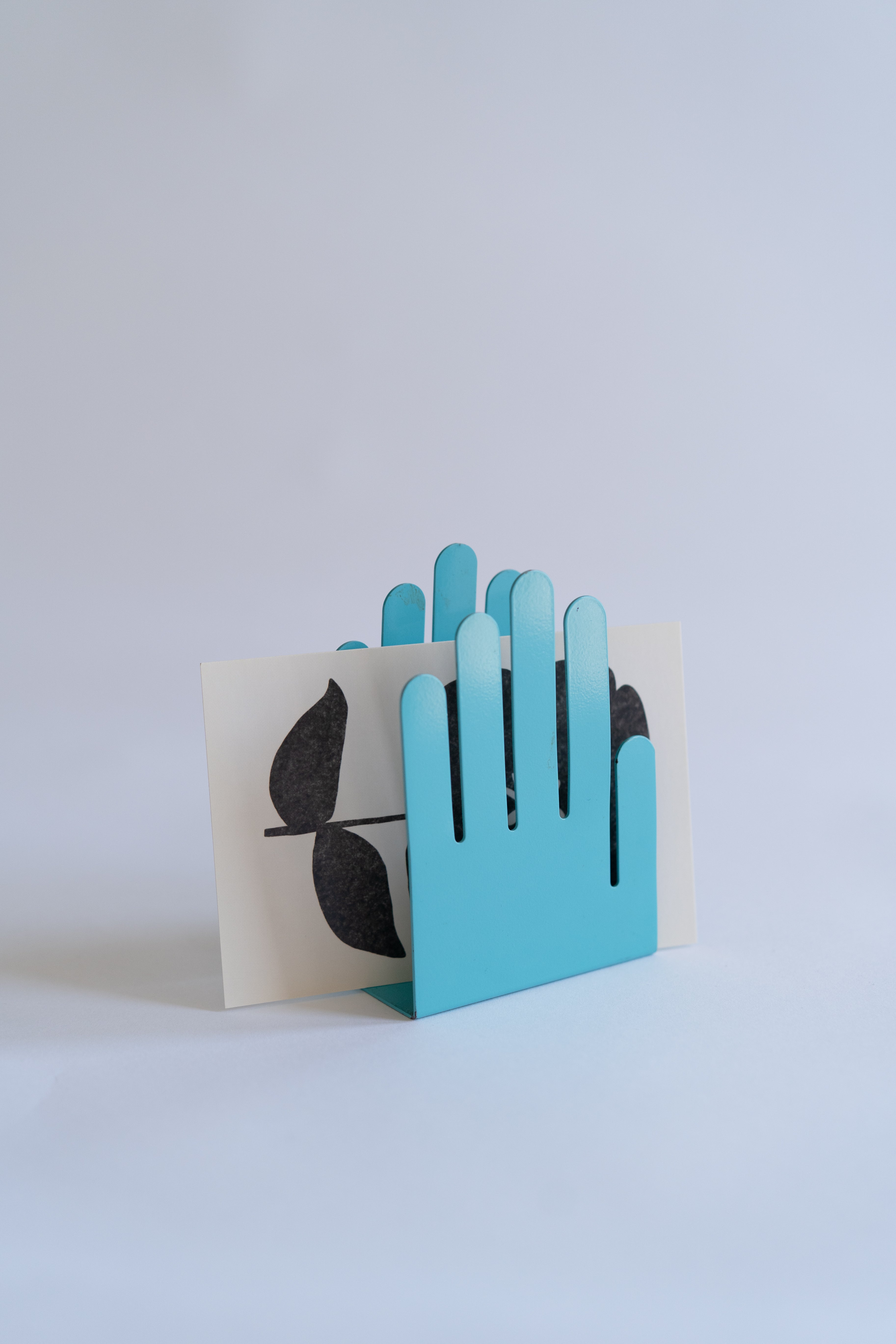 Blue metal hand-shaped letter holder. Versatile and can be used to hold literature, notes, and records. Produced by Spectrum Designs. Made in the USA.