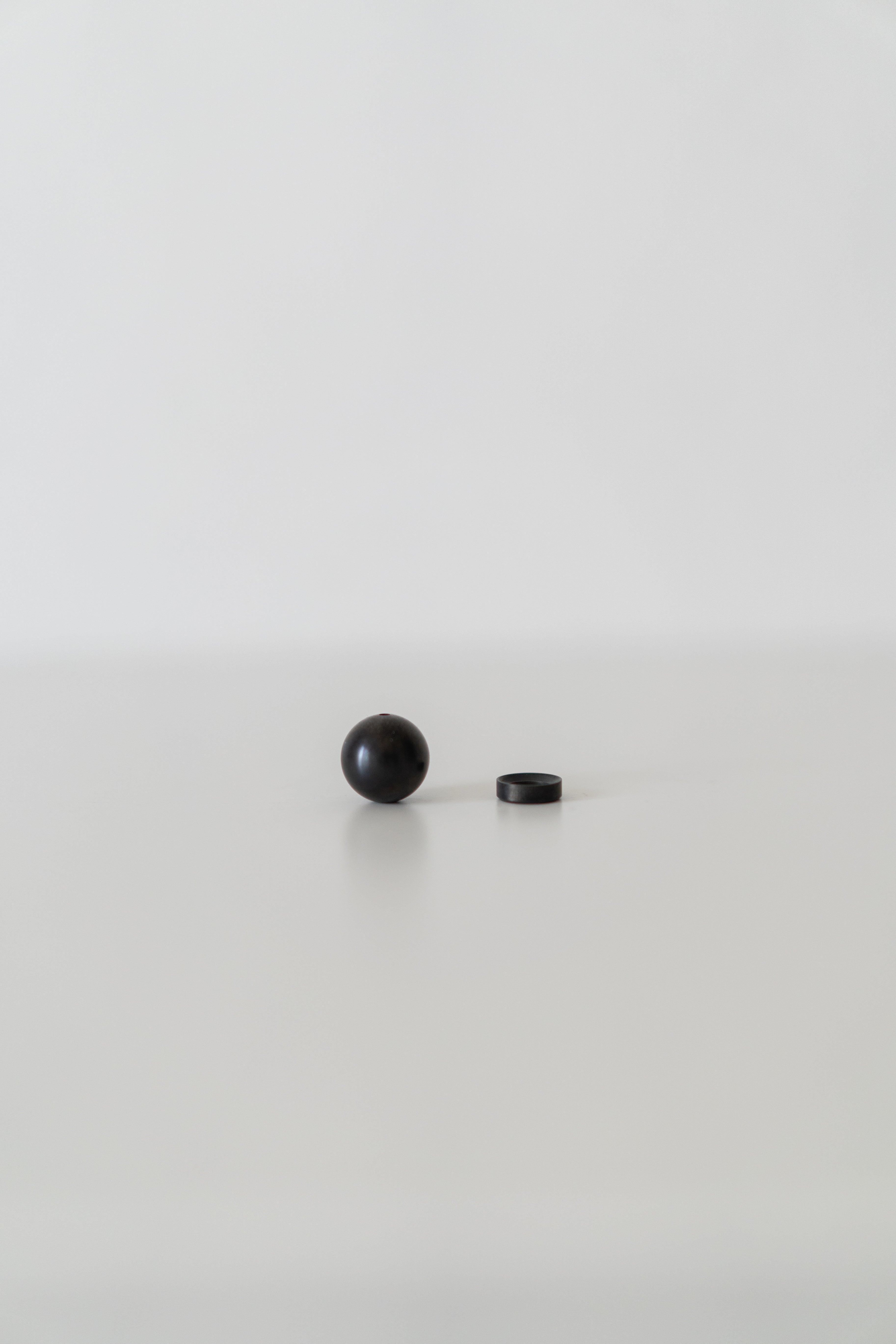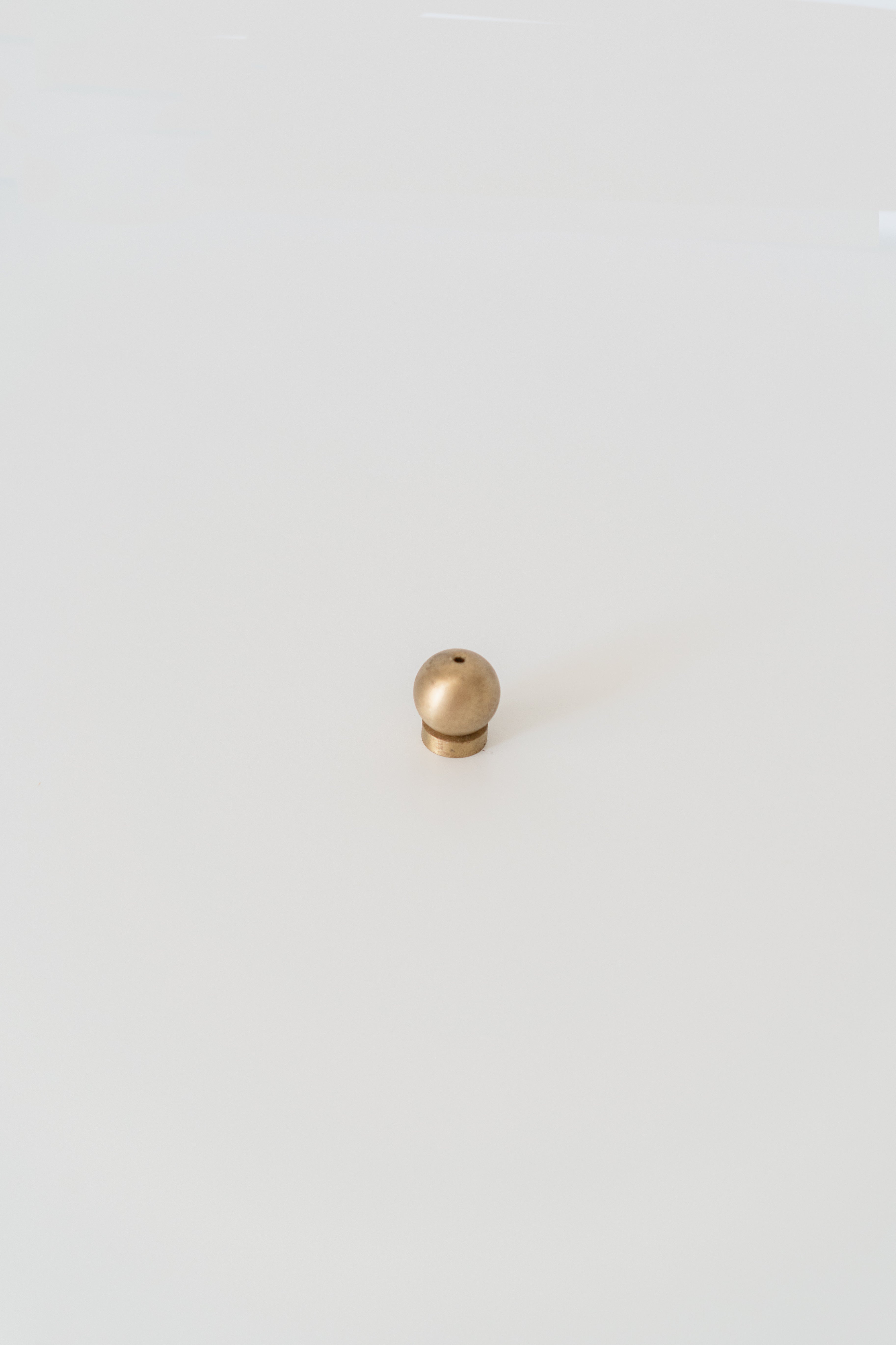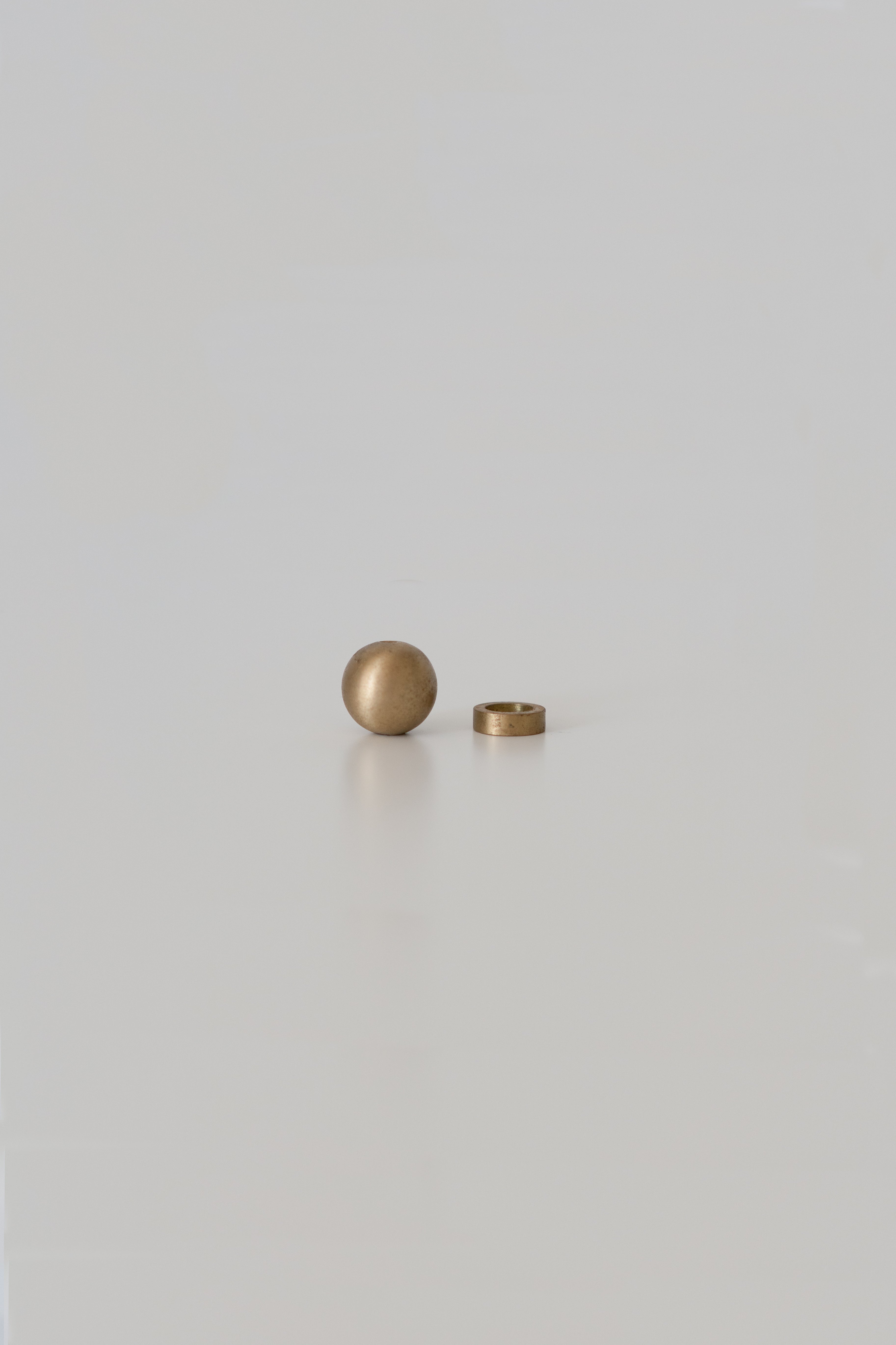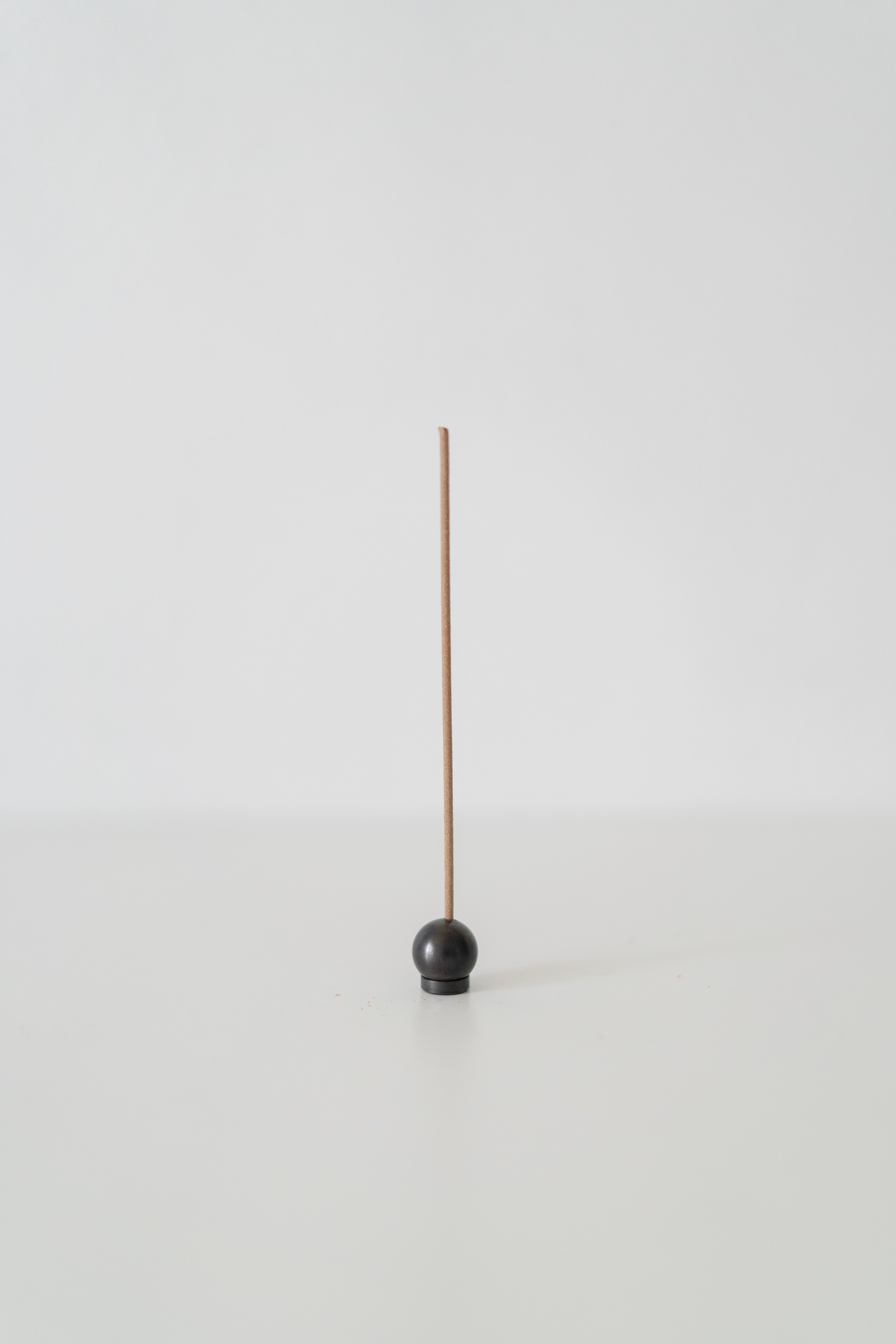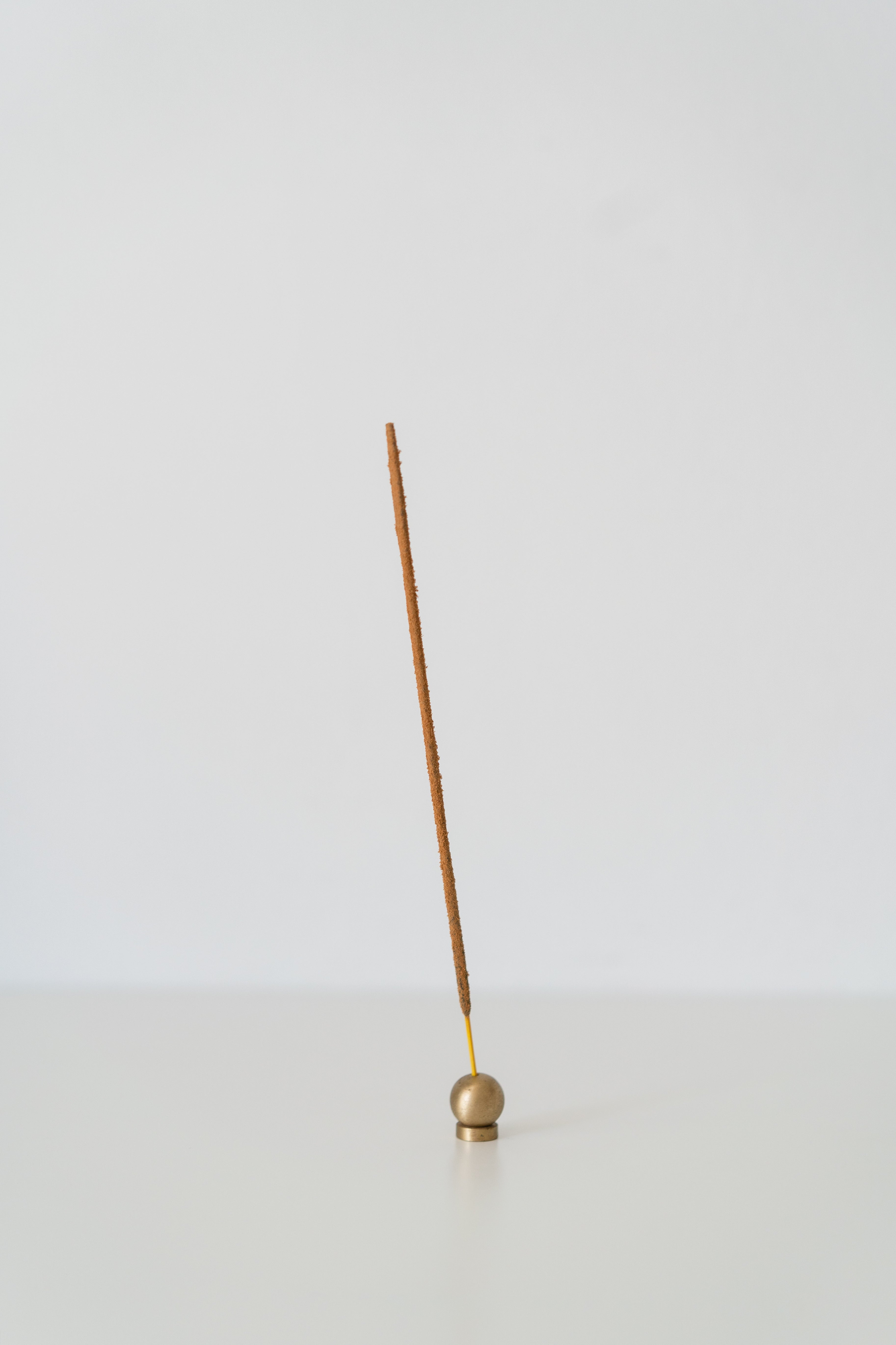 Spherical incense holders cast in solid brass, comprised of a ring base and sphere piece. The sphere swivels to angle the incense at any direction, and features two hole sizes to accommodate thin and thick incense stick diameters.