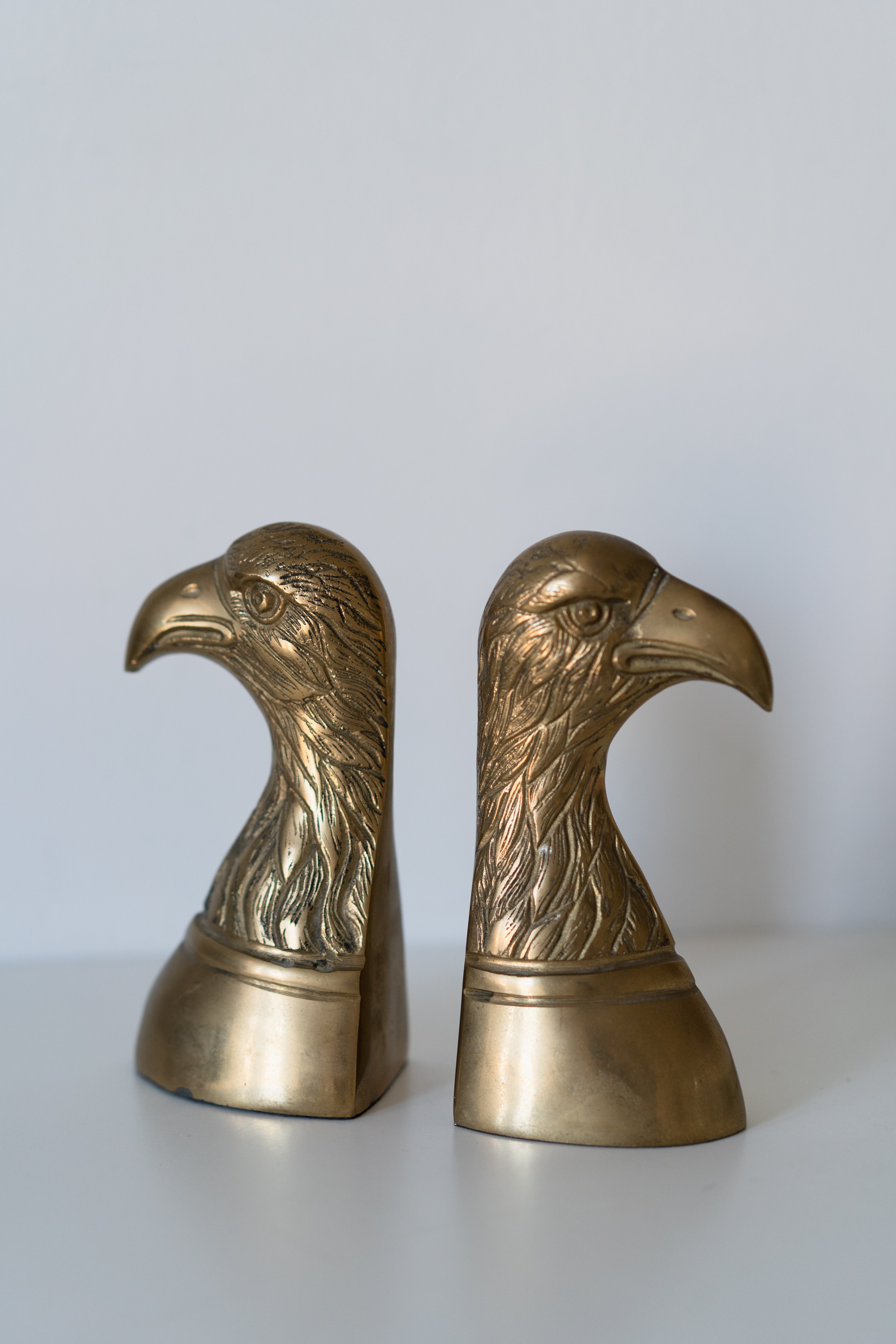 Heavy and solidly crafted brass eagle head bookends featuring intricate detailing on the feathers and beak. The set has developed a charming patina over time, adding to its vintage appeal.