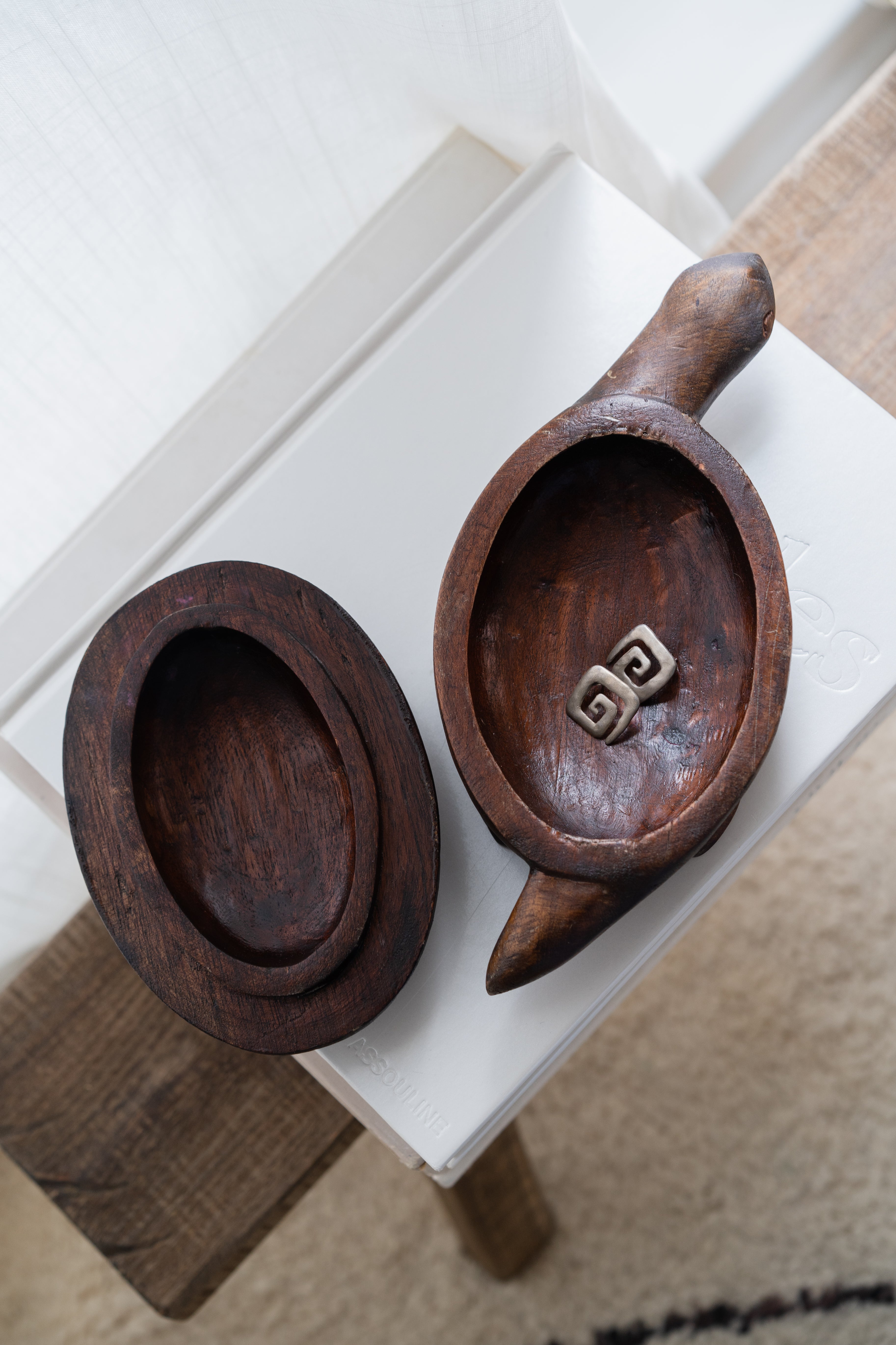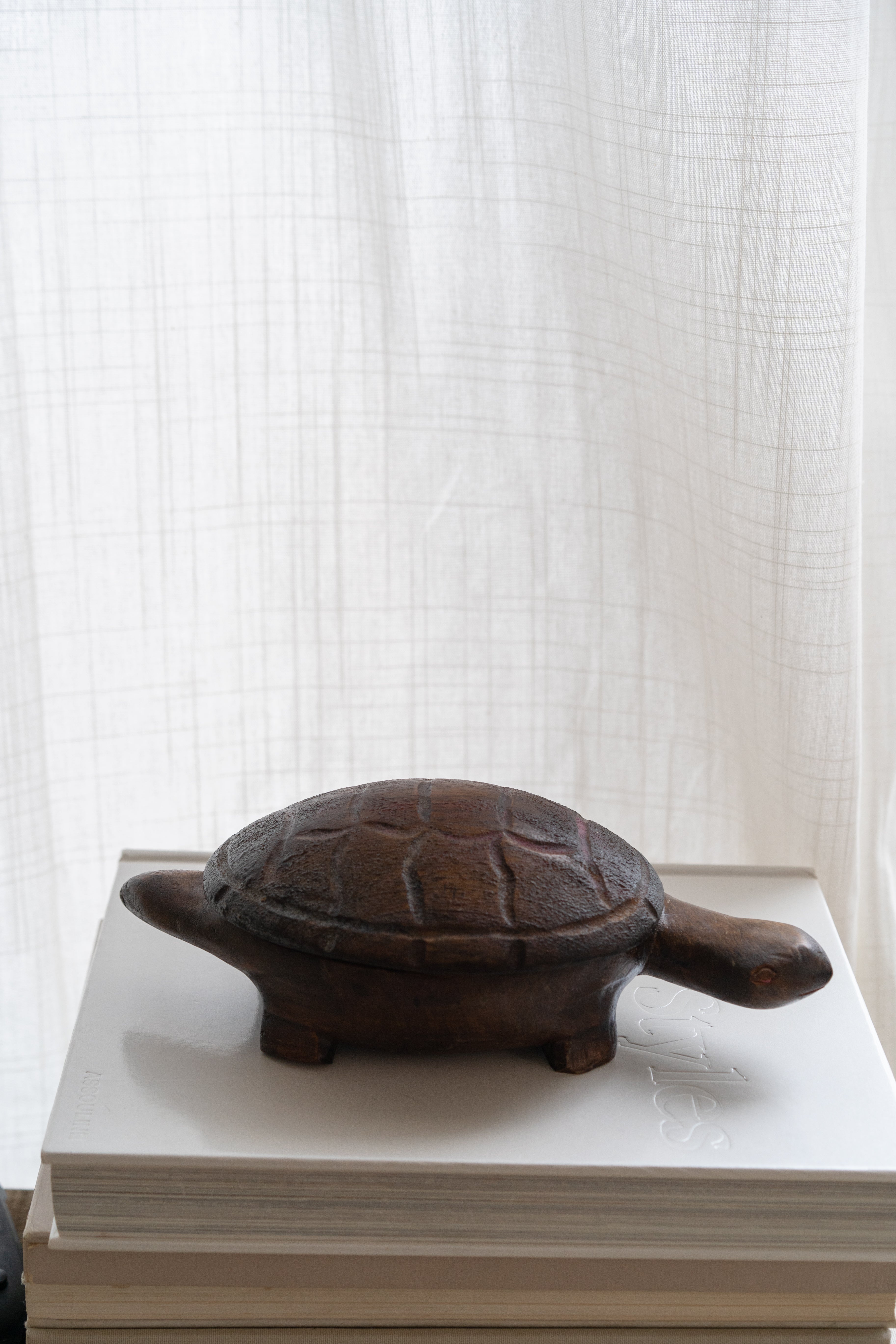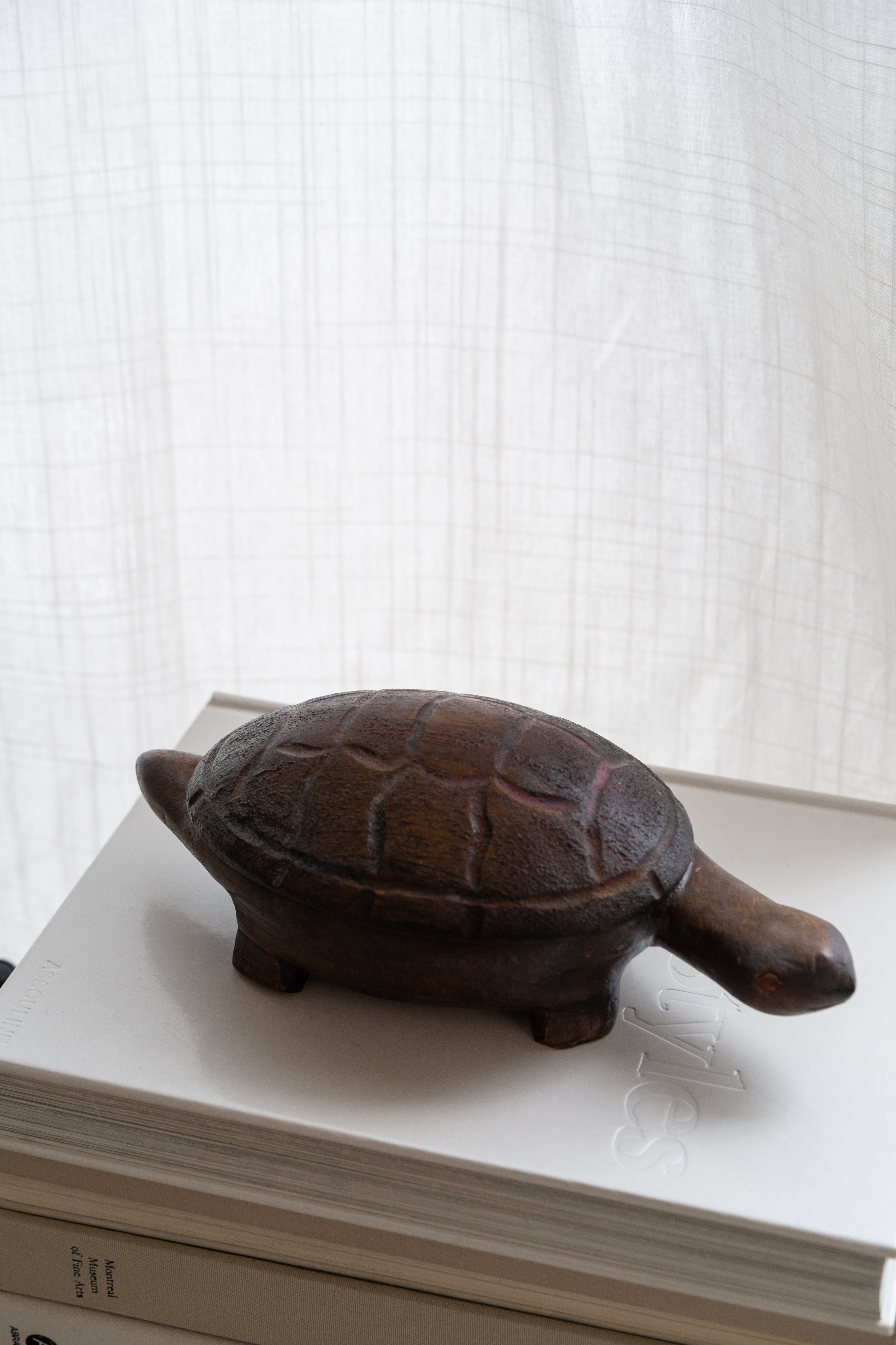 Hand carved folk art turtle box with removable shell lid.
