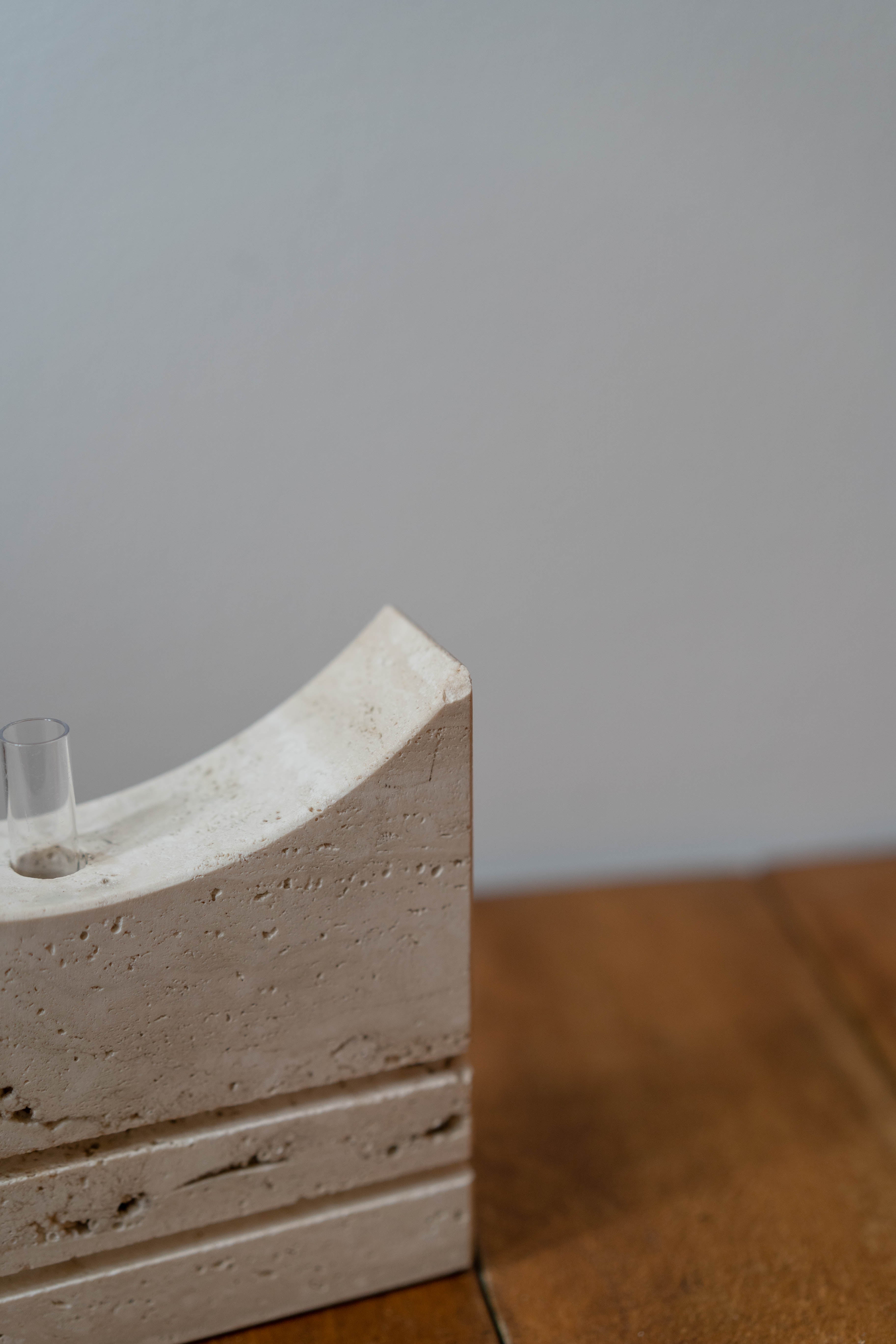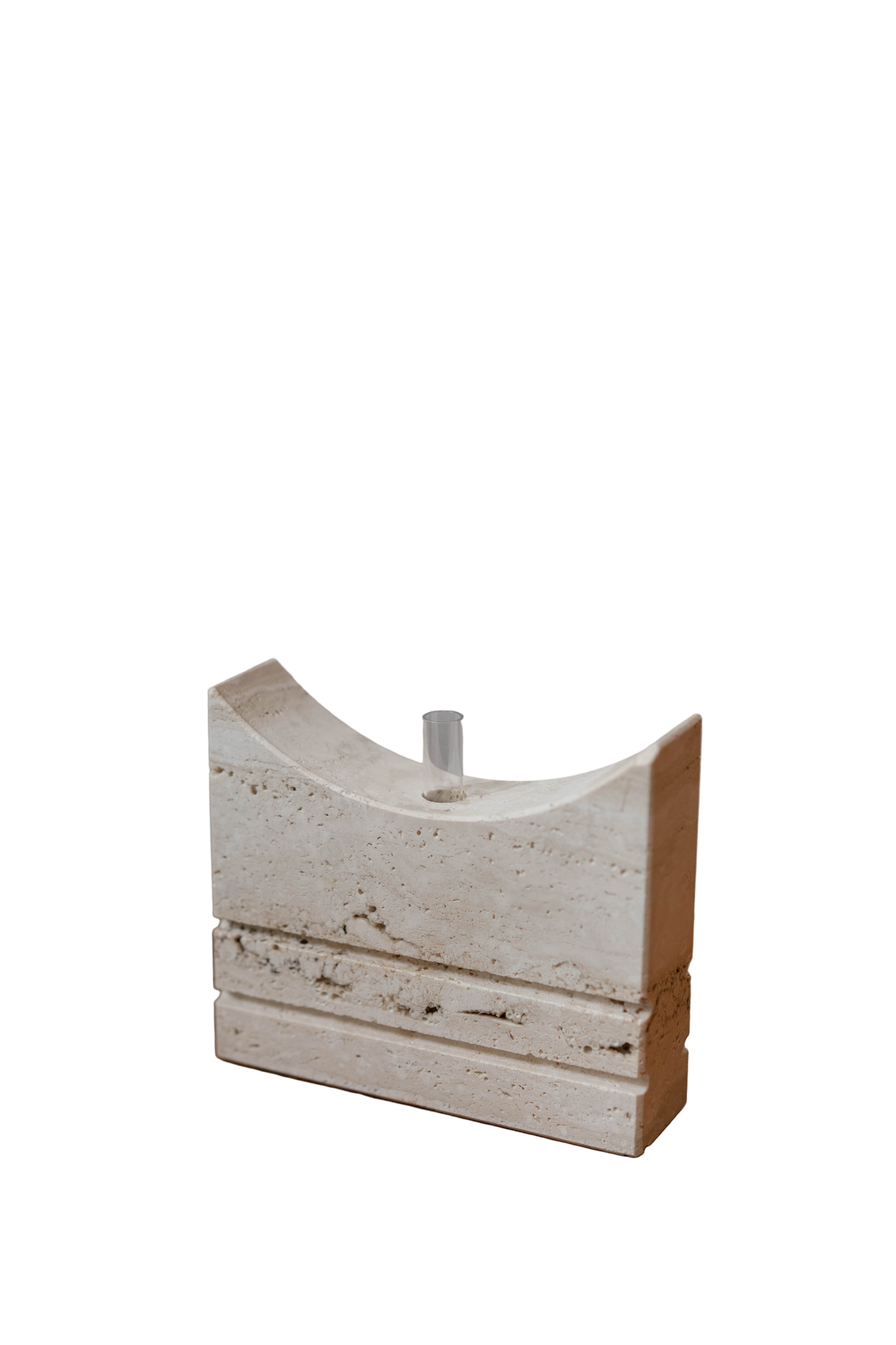 Sculptural honed travertine vase attributed to Italian designer Fratelli Manelli, circa 1970s. Features a curved crescent form with a central opening, fitted with a single glass test tube for fresh or dried stems.