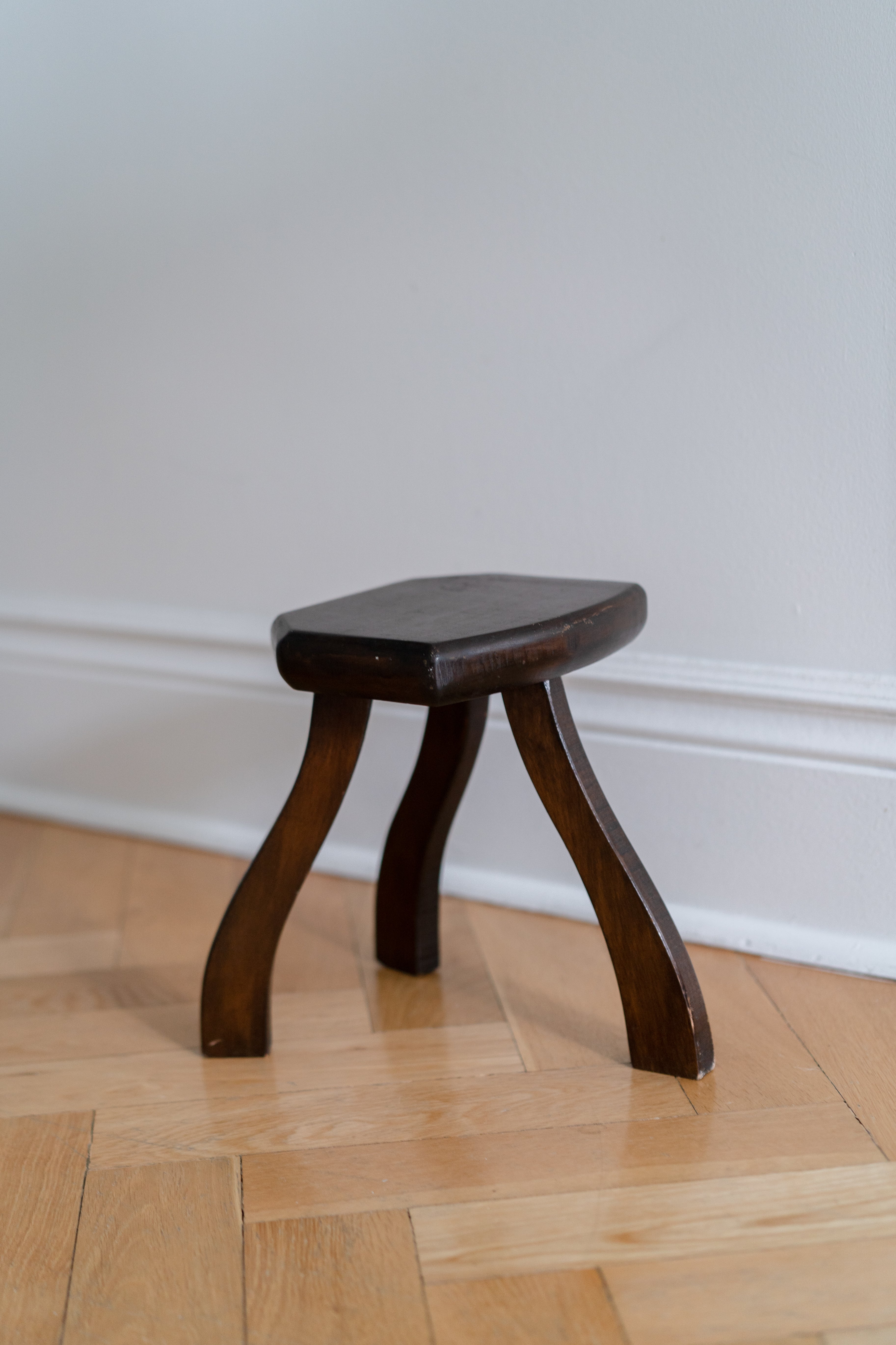 Tripod milking stool featuring curved legs and six-sided top. Works beautifully as a plant stand or accent piece in your space.