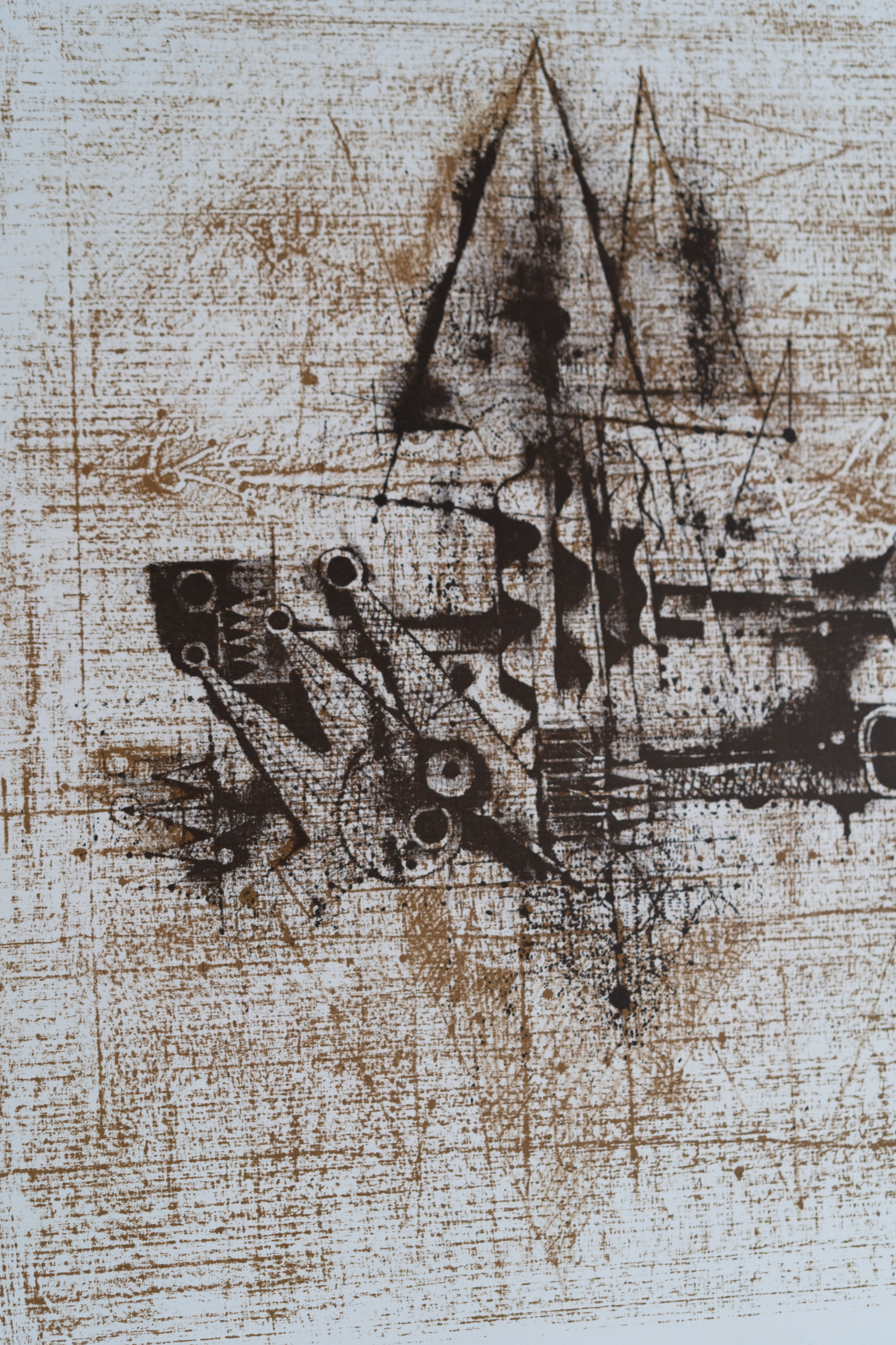 Johnny Friedlaender abstract exhibition lithograph announcing his works at the Musée d'Art Contemporain, Montréal. Housed in a gold metal frame. Not under glass. Produced by Mourlot Editions.