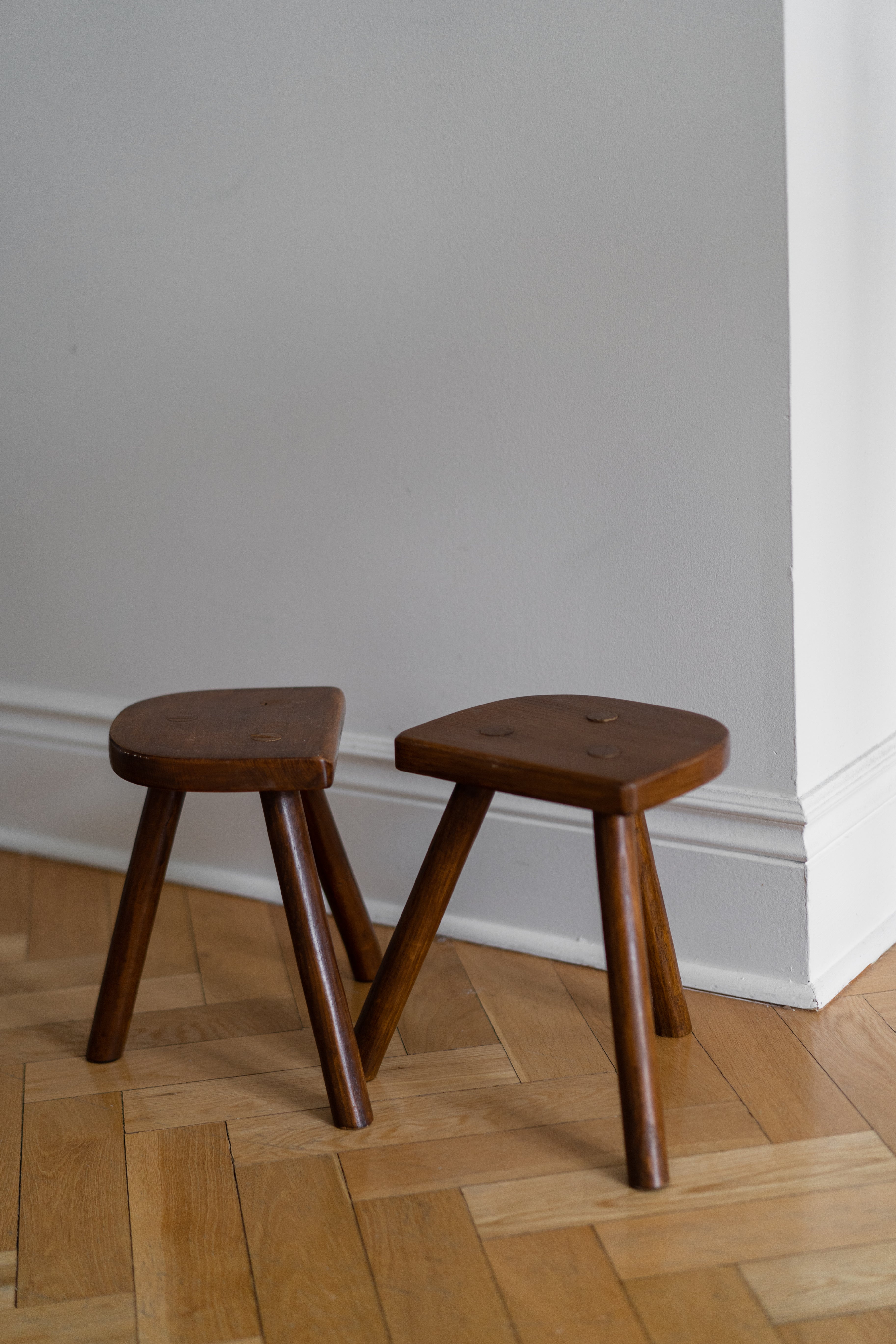 In very good vintage condition. 1 of stools has visible wear on the bottom of one leg. See last photo for reference.