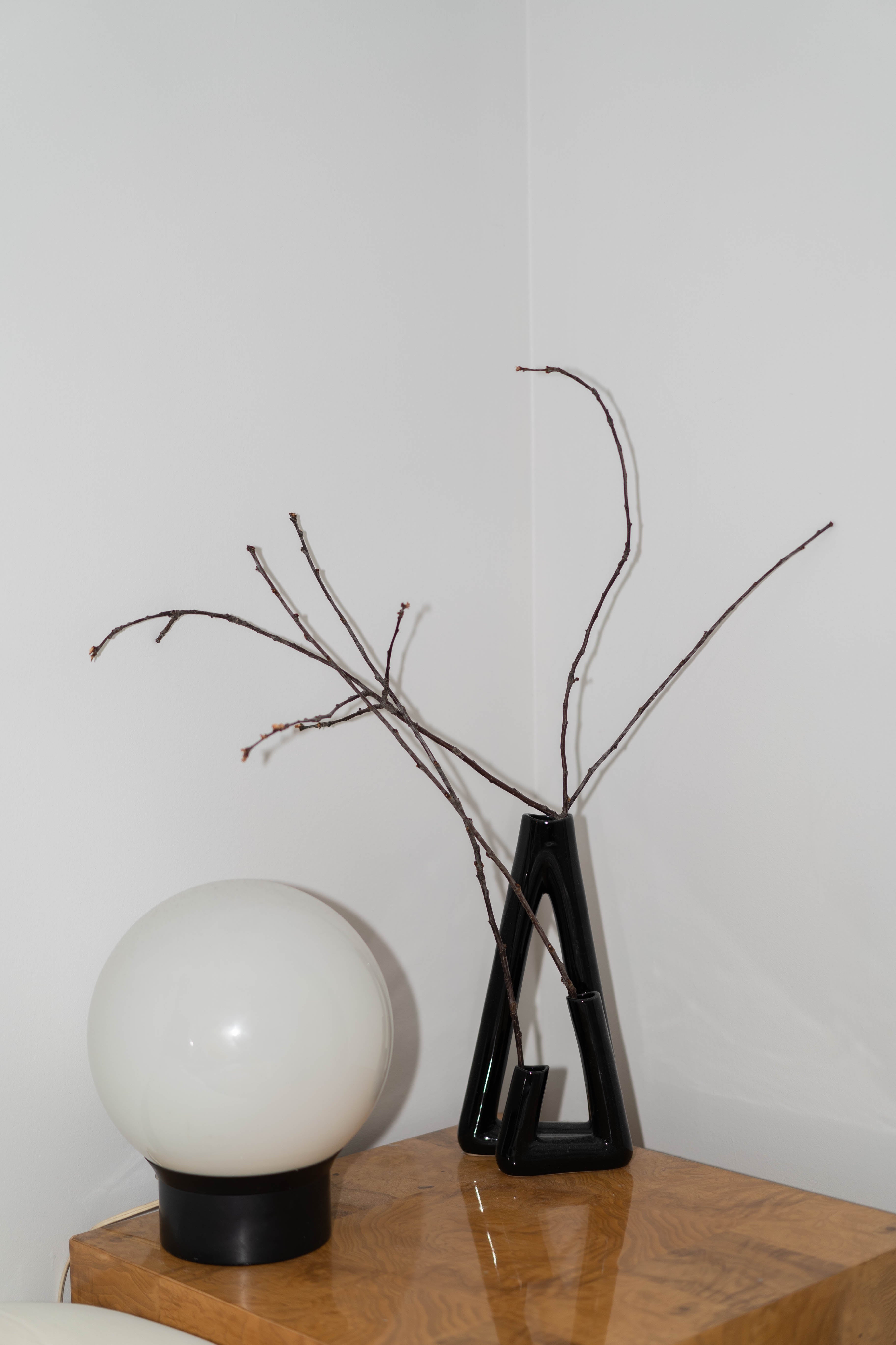 Postmodern ceramic vase featuring a shiny lack glaze, and two openings for stems. Made in Japan.