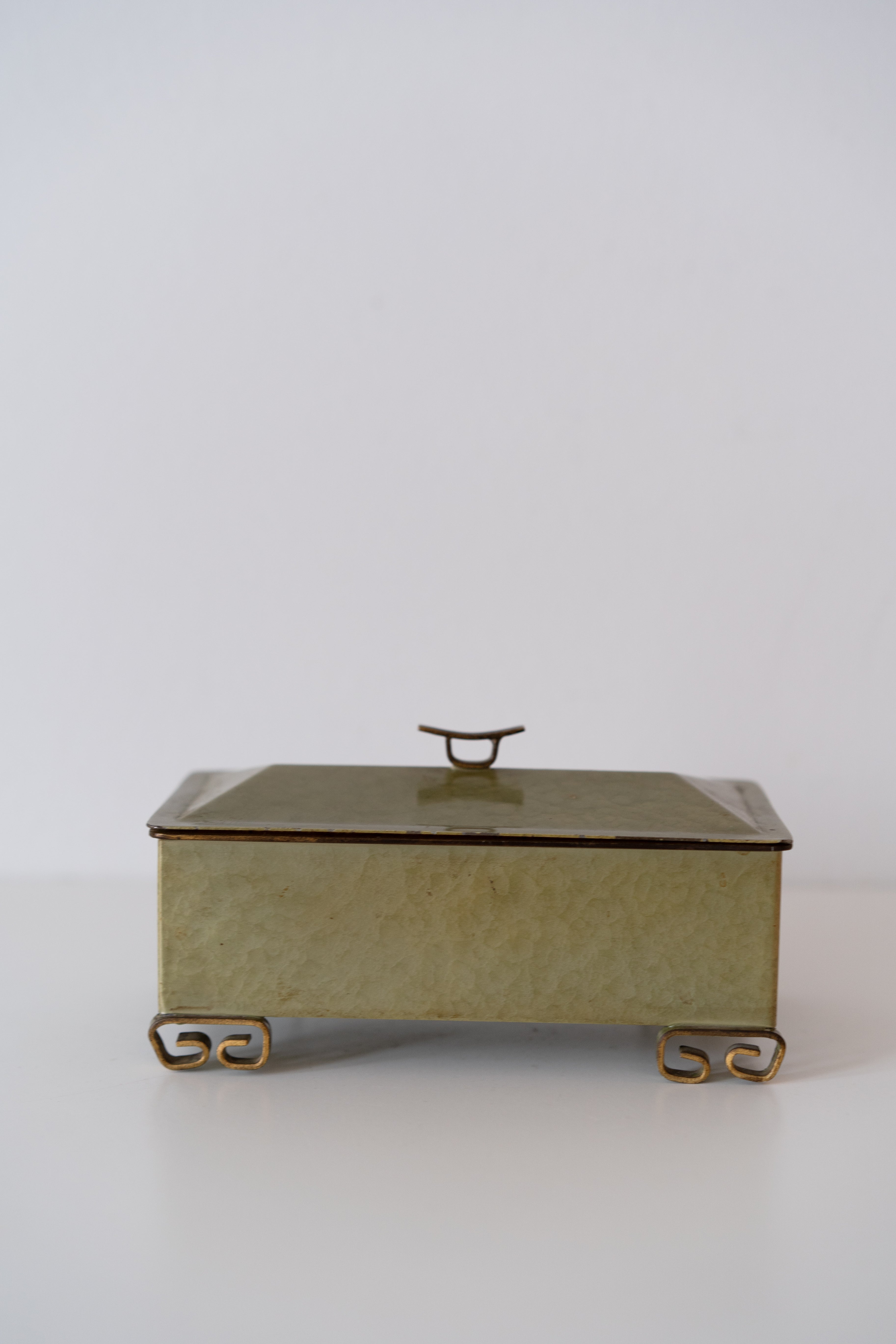 1950s trinket box in olive green featuring a hammered metal with enamel finish, brass handle and feet. Lined with cork. Handmade in Pasadena, CA.