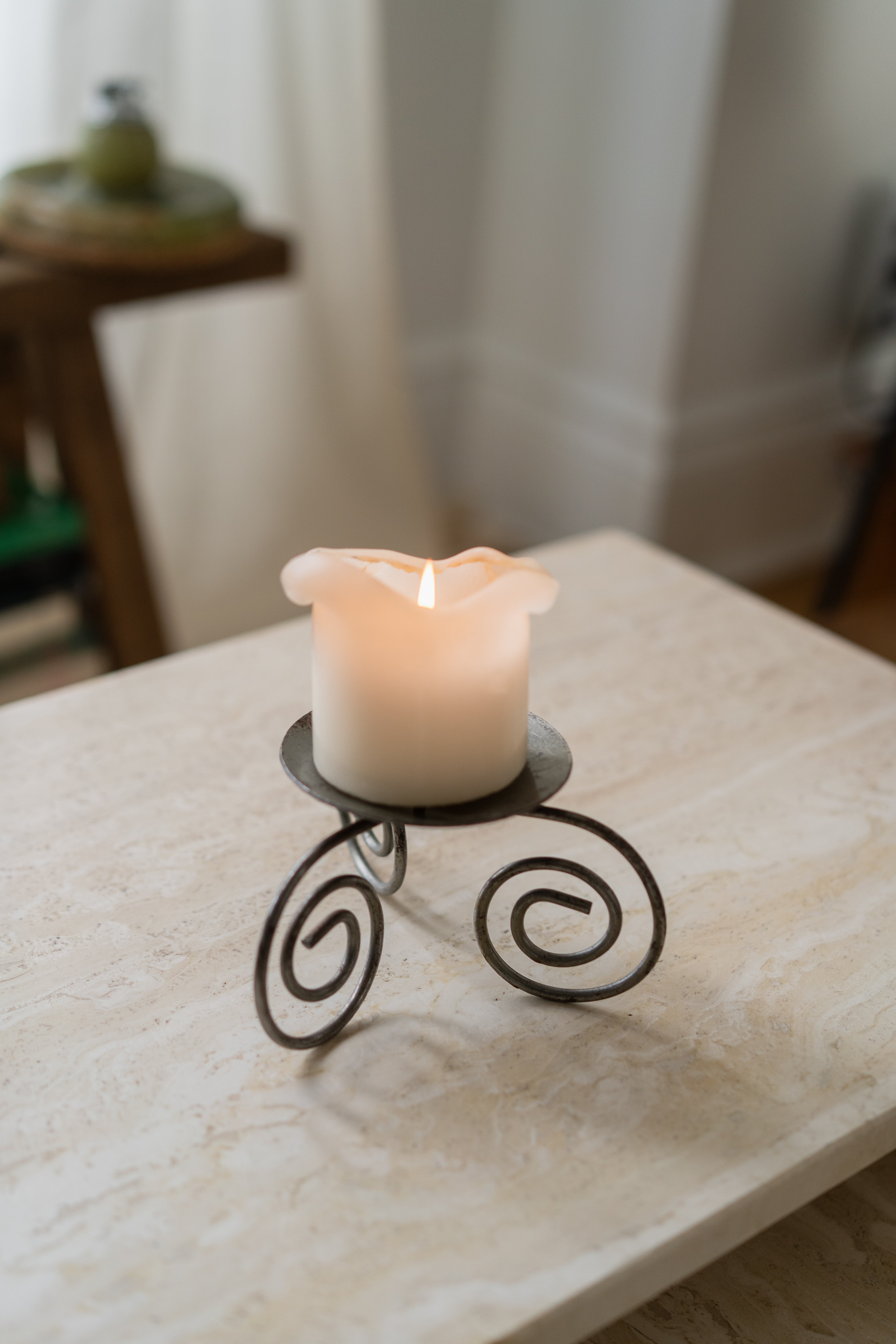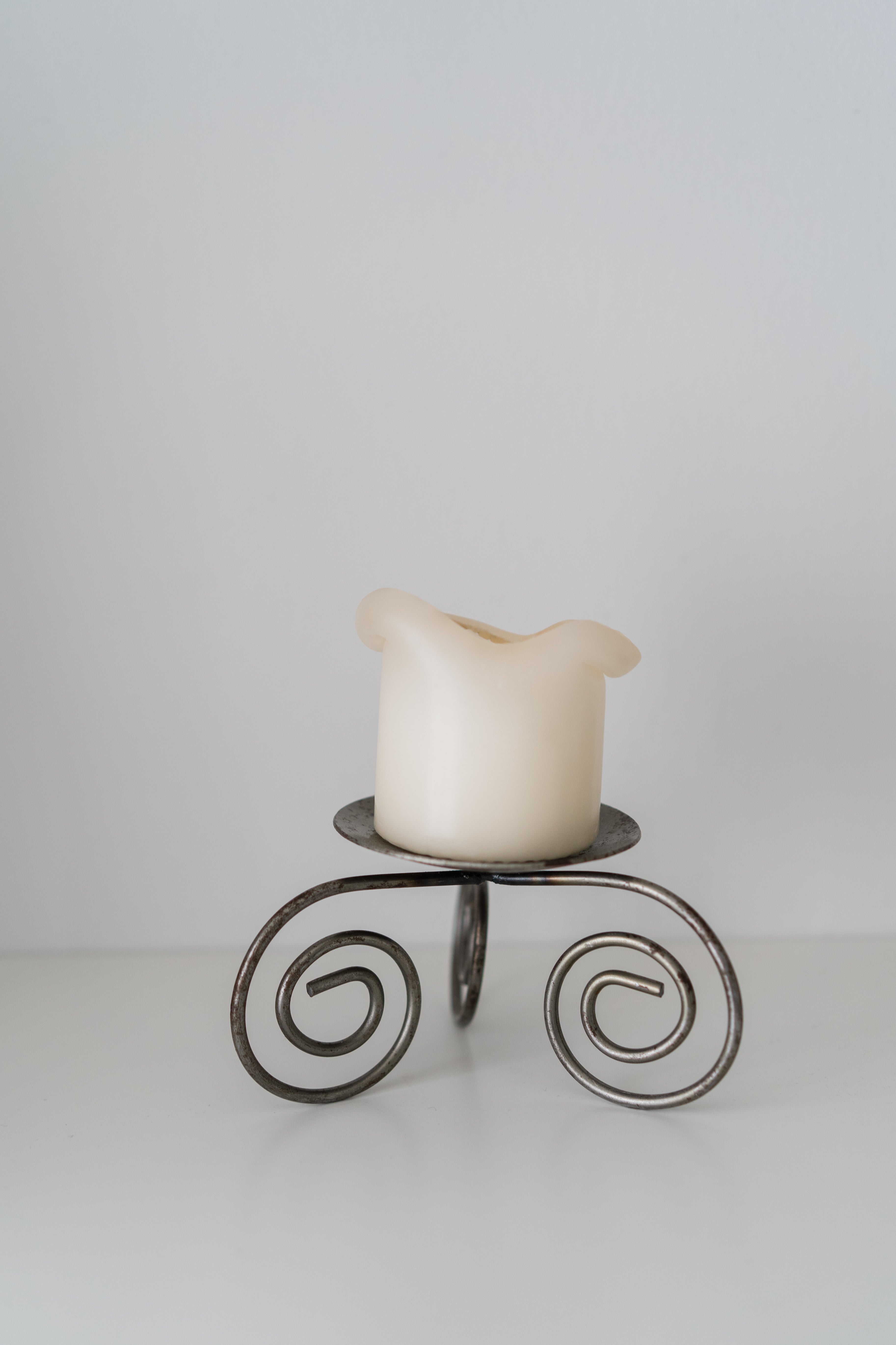 Metal tripod candle stand, featuring three spiral legs as a base.