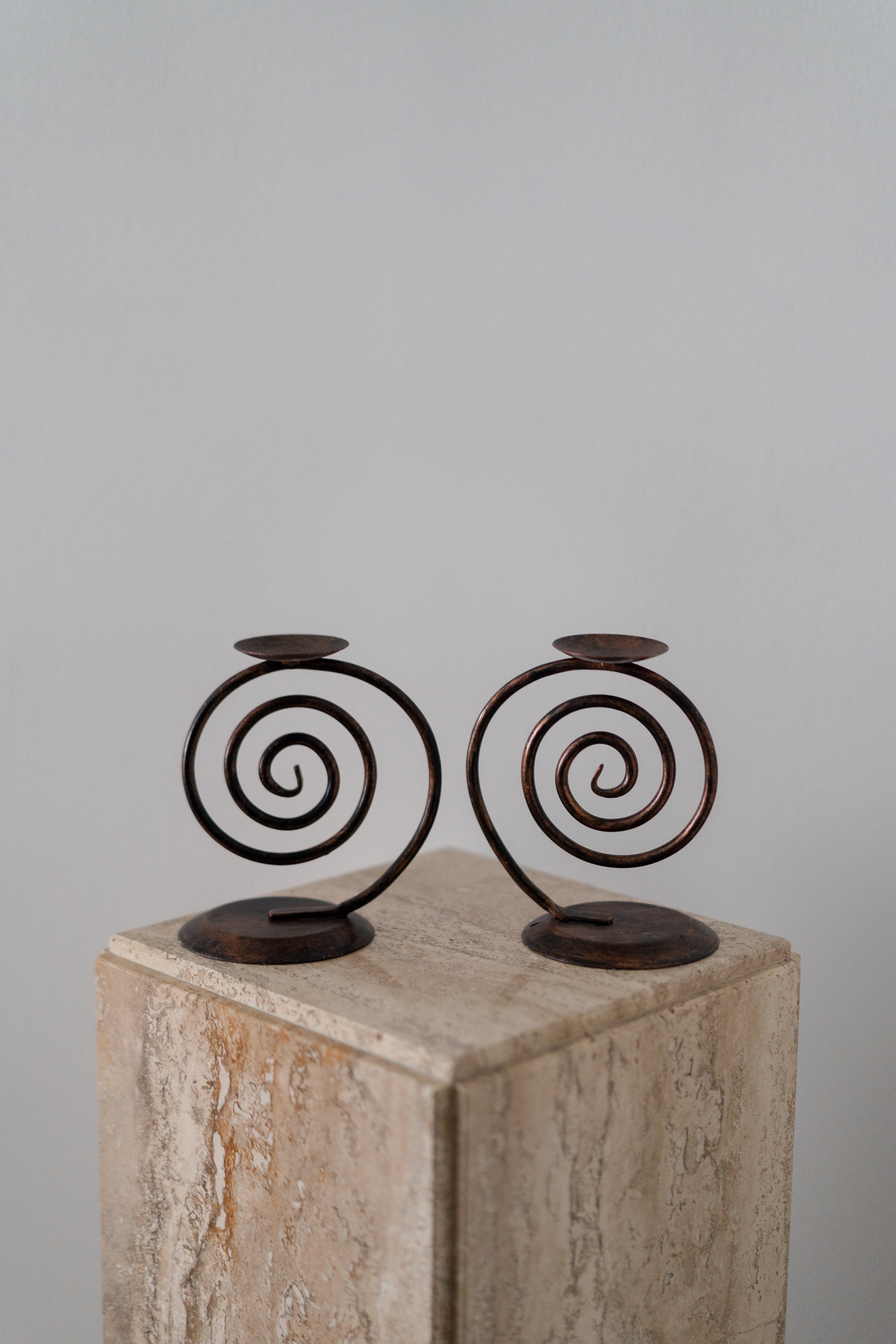 Metal spiral candle stands featuring a black and coppery finish. Sold as a pair.