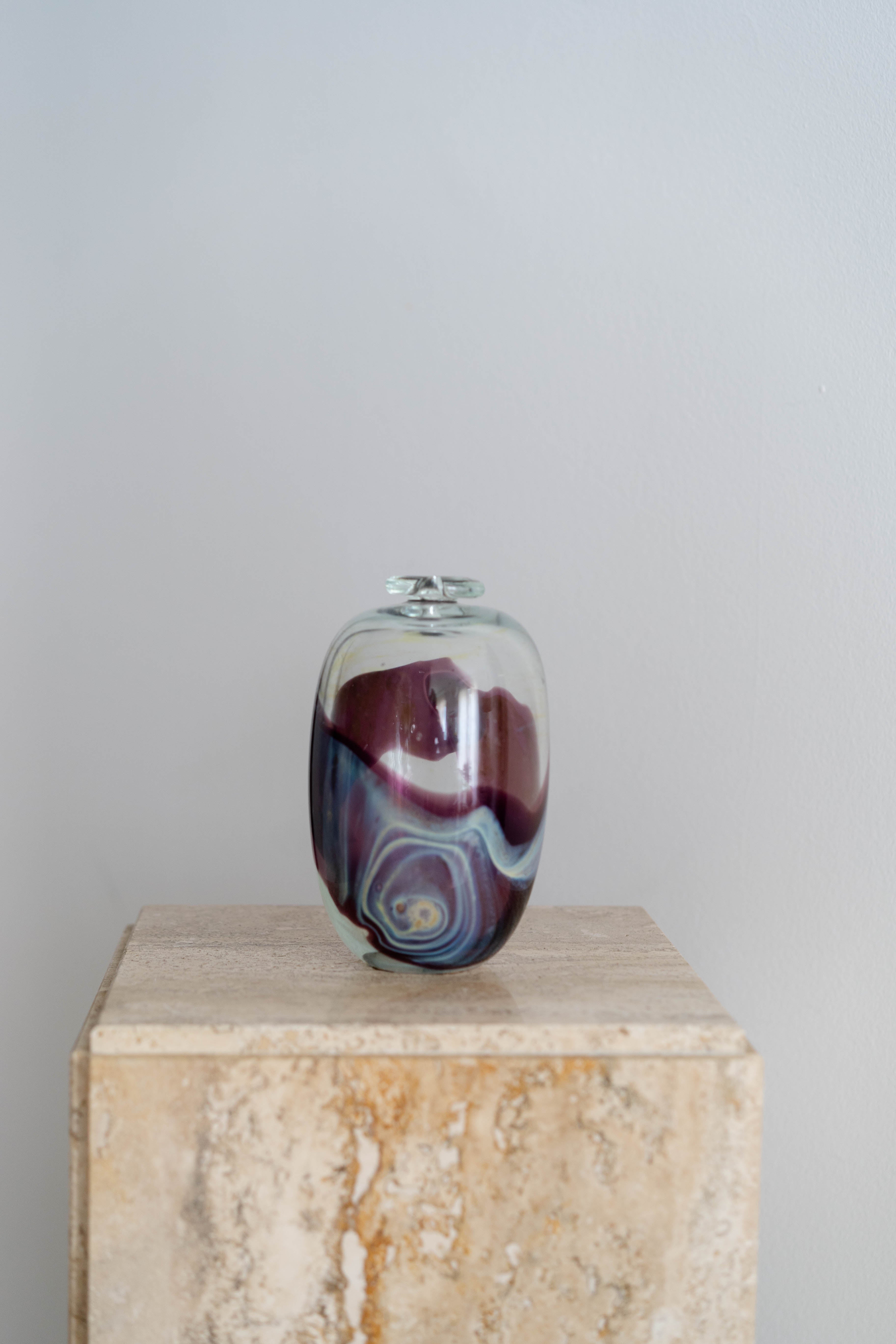 Clear handblown glass vase with swirling accents of purple and blue. Compact and weighty, with a small tapered opening perfect for a single stem or as a standalone decorative piece.