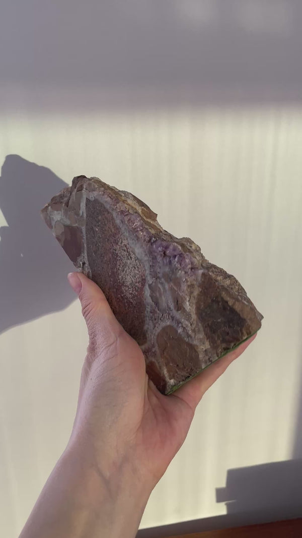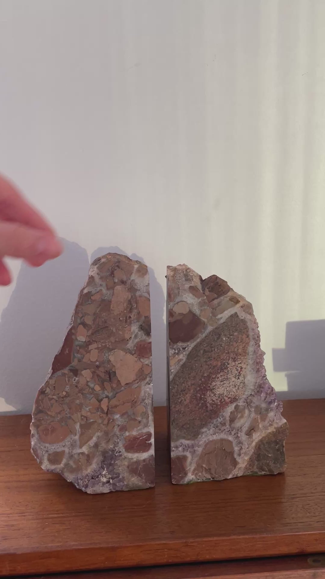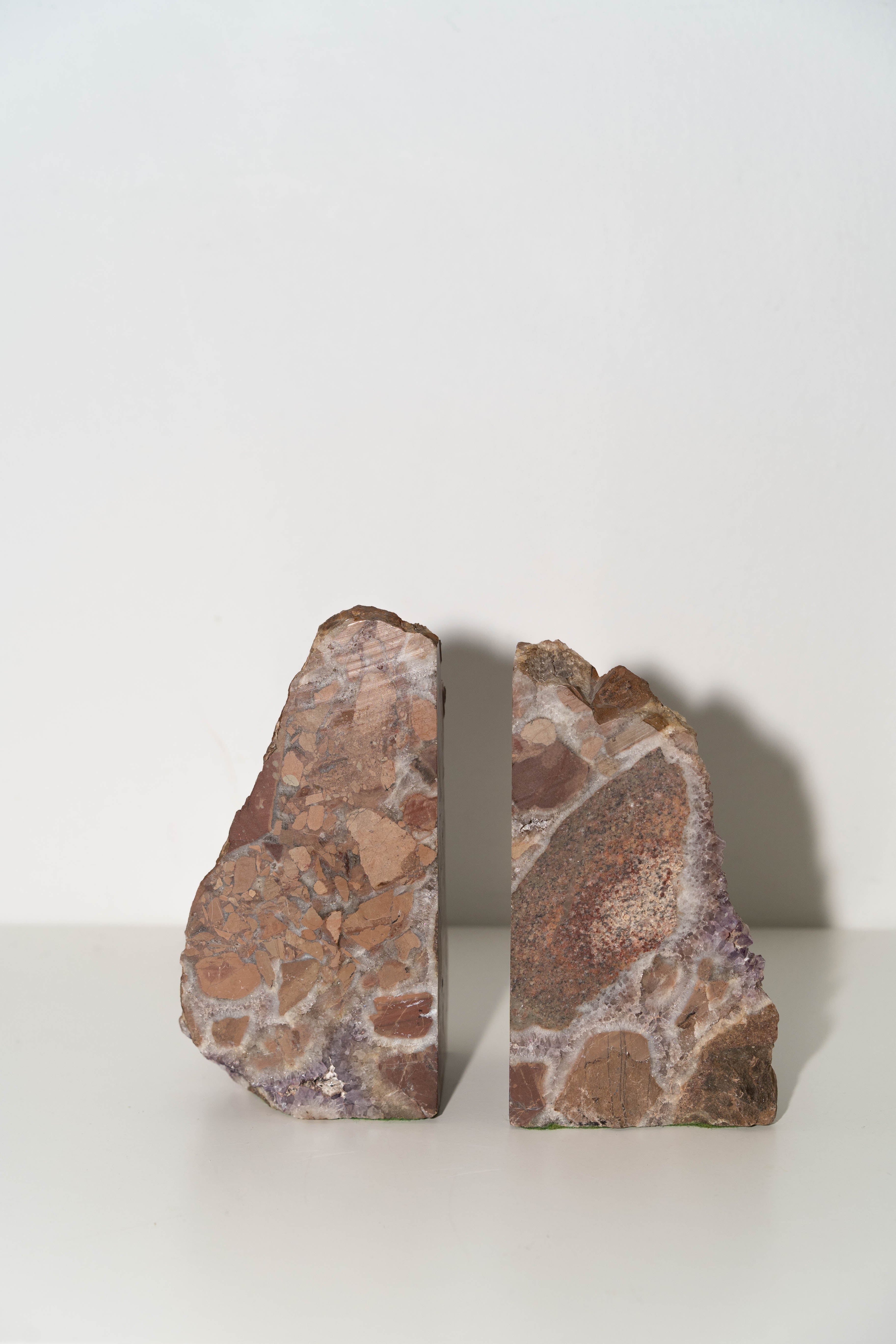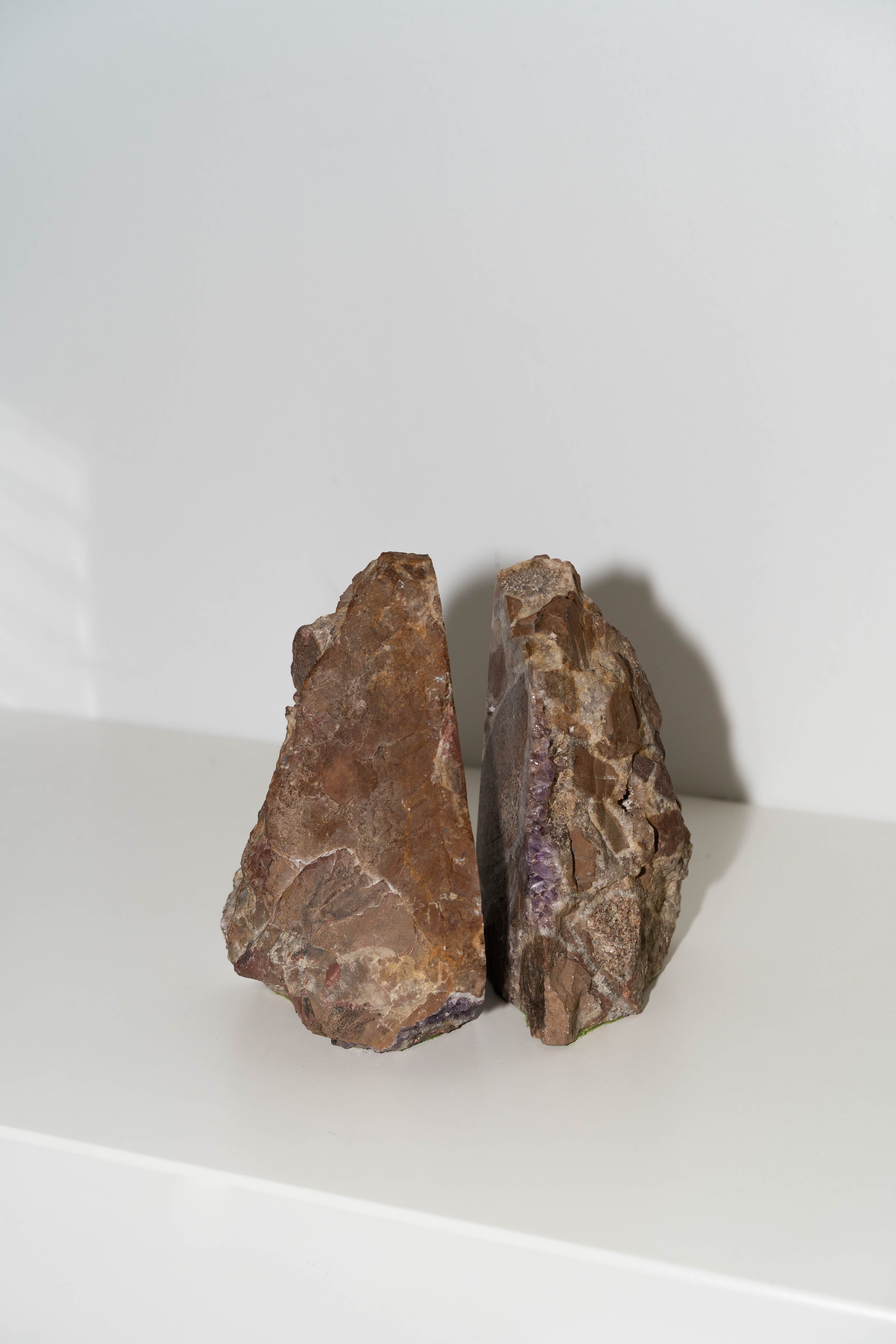 Vintage stone bookends featuring raw surfaces, highlighting the stone's unique beauty. Crafted from raw amethyst from the Thunder Bay region during the 1960s. Felted at base.
