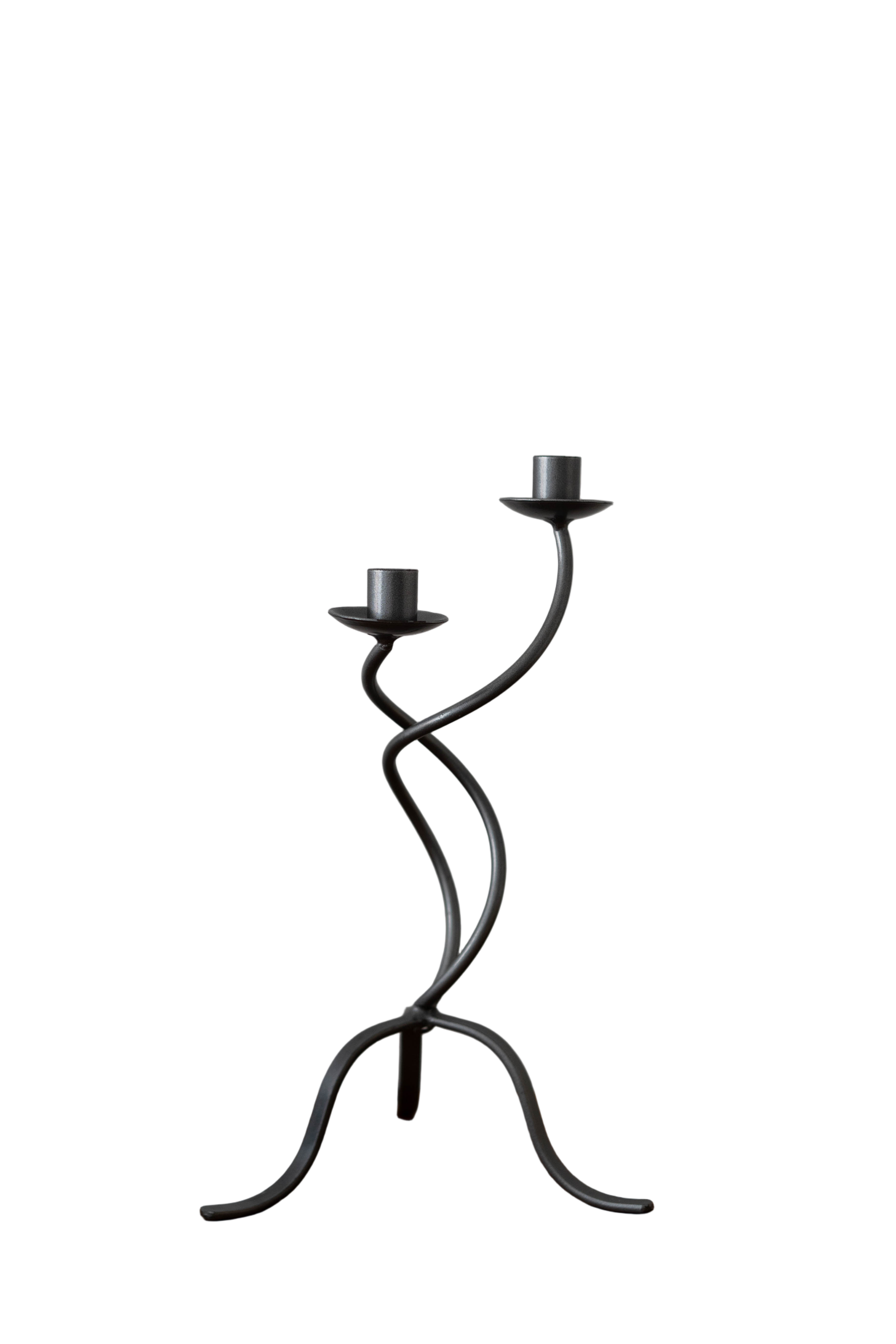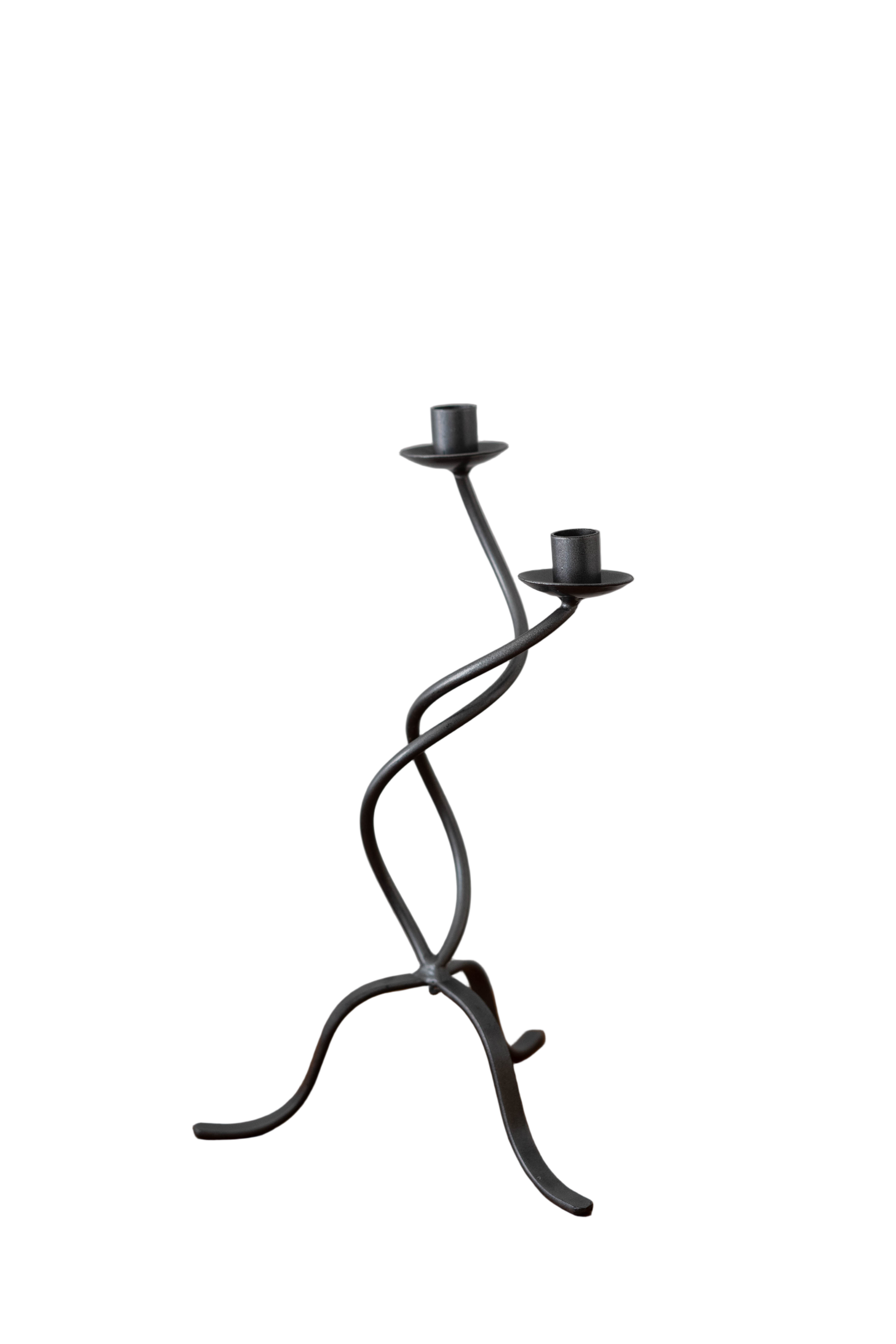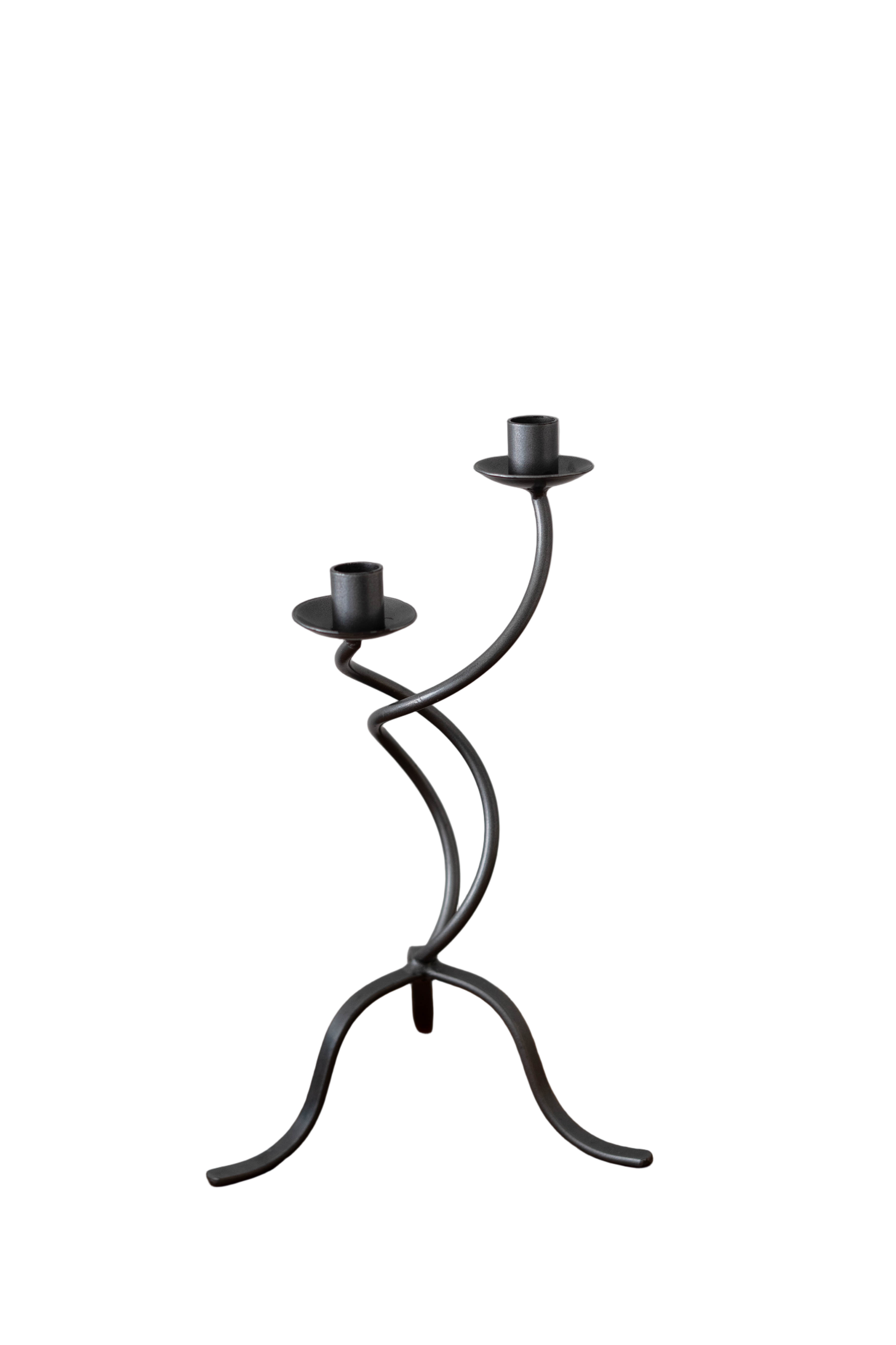 Sculptural grey metal candelabra with a fluid, twisting form. Holds two standard tapers.