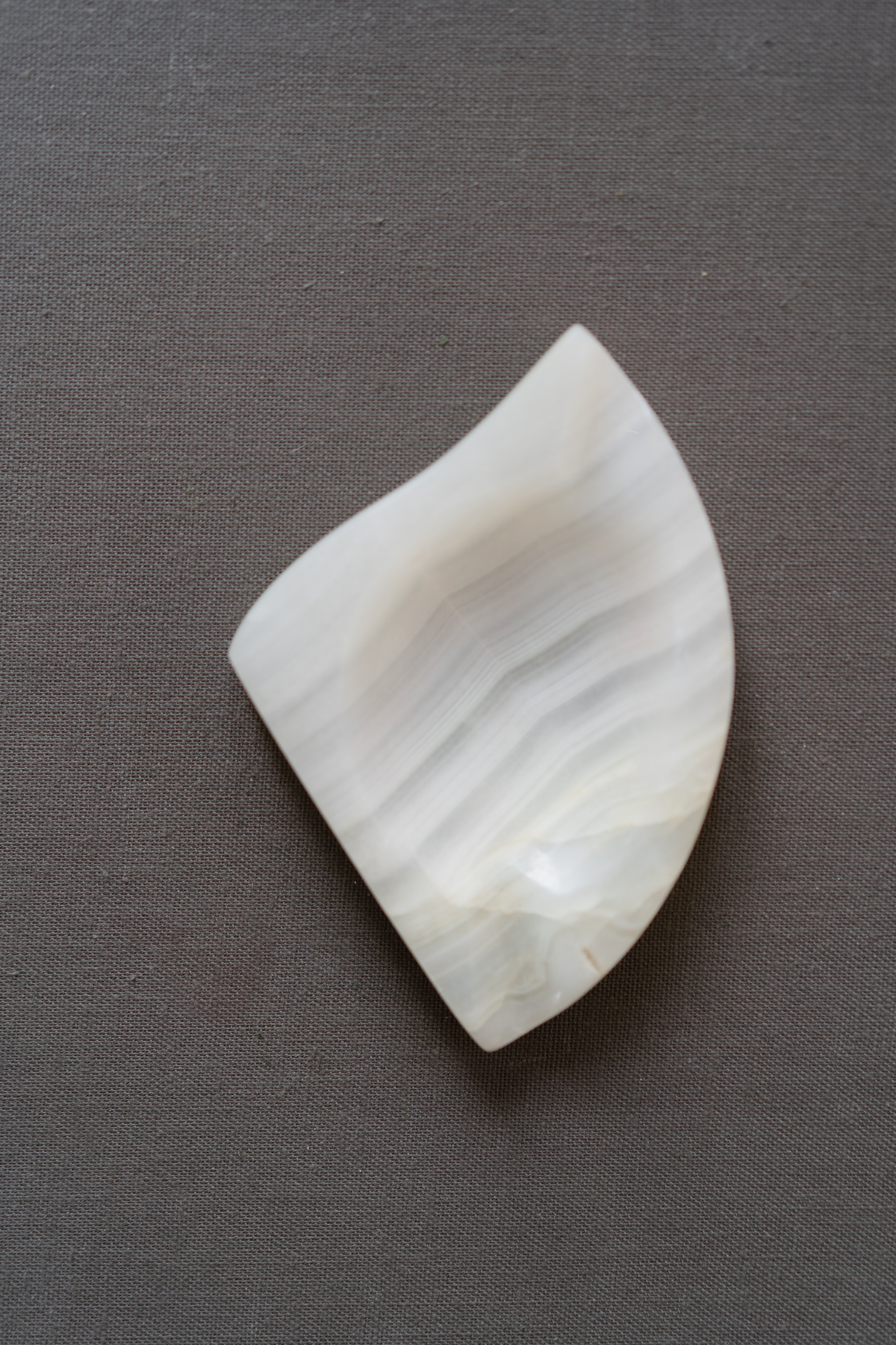 Vintage ashtray crafted from white banded stone, featuring an organic wedge shape and striped banding.