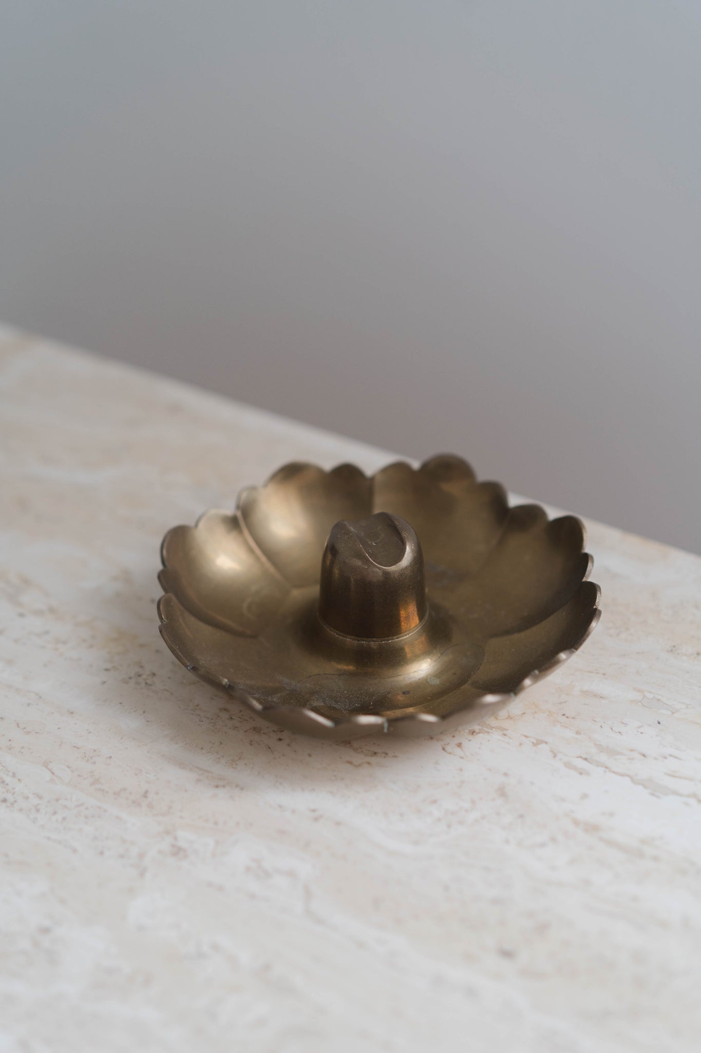 Round brass ashtray with a scalloped edge and a raised central form featuring a single cigarette rest. Well suited as tabletop decor or for holding jewelry or keys.