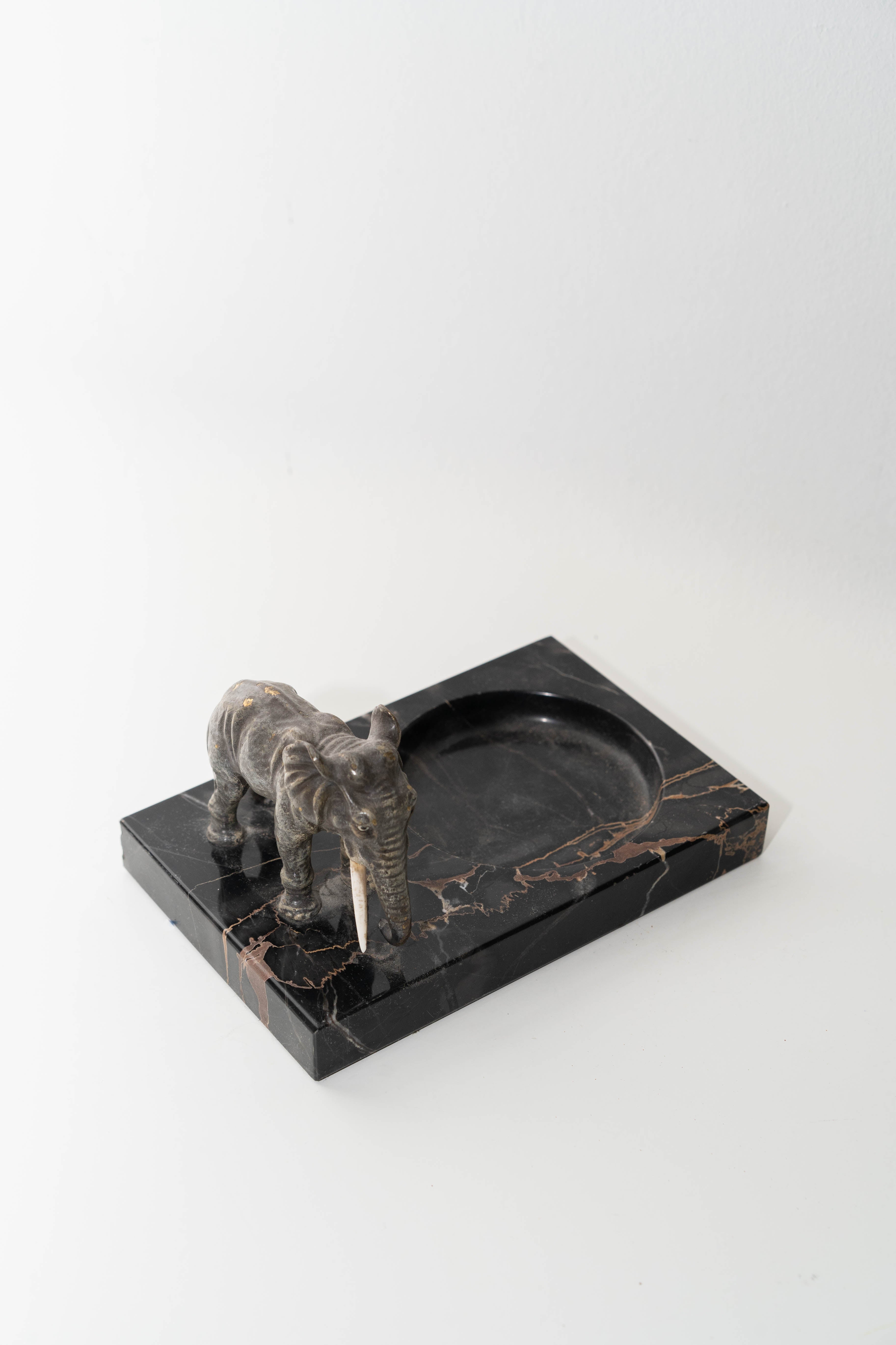 Vintage catchall featuring a bronze elephant statuette mounted on a black marble base. Perfect for holding keys, coins, or jewelry.