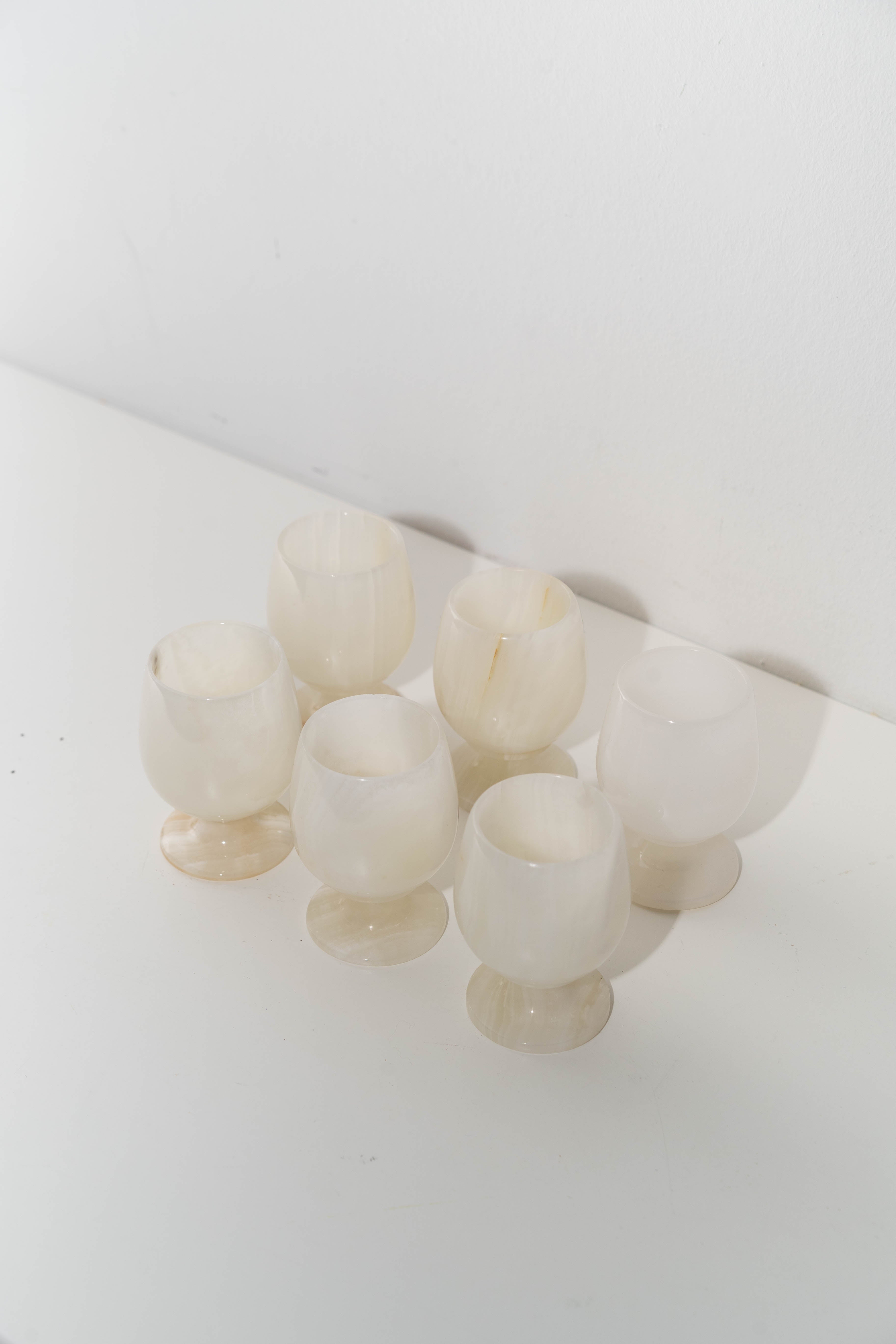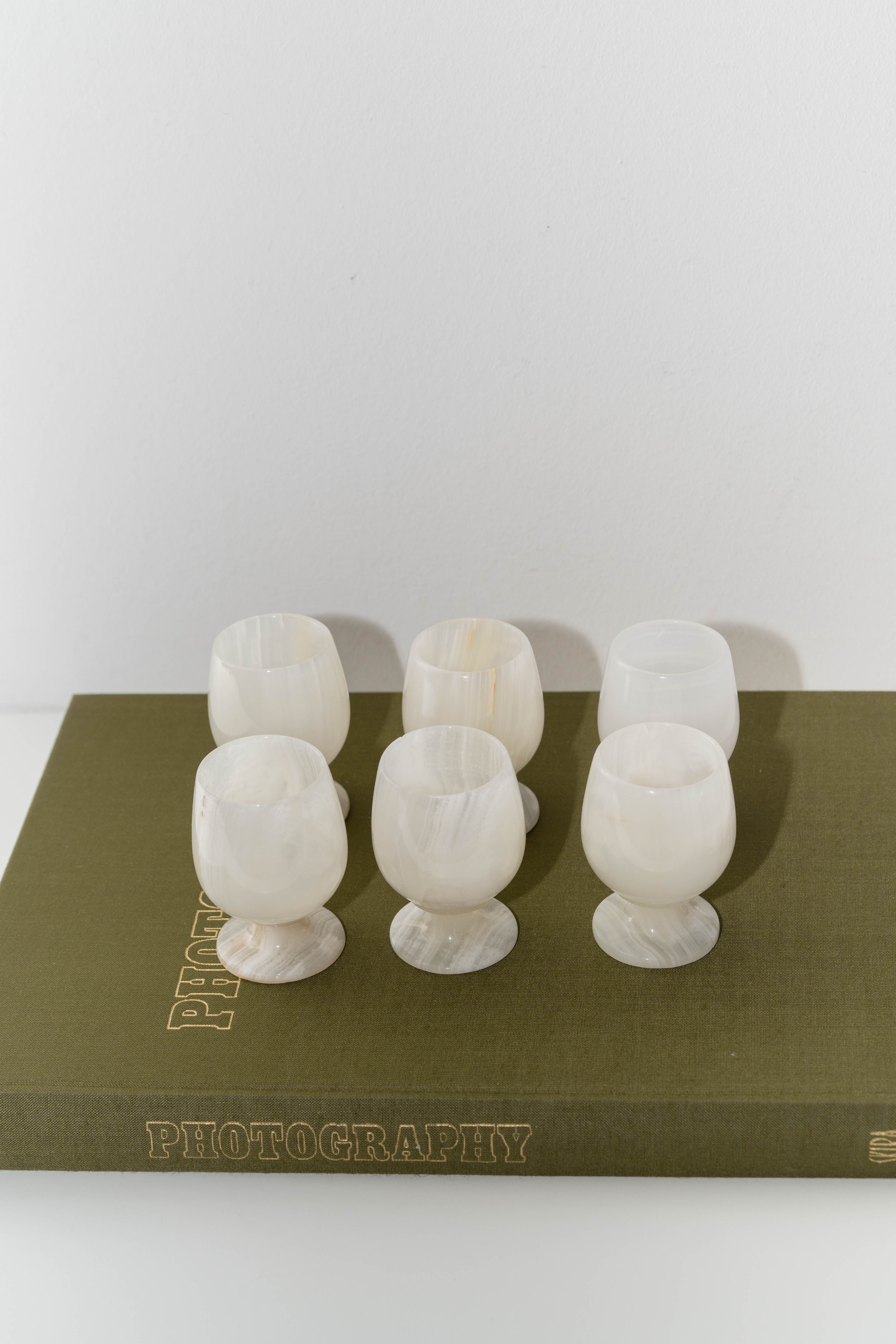 Set of six mini onyx goblets featuring natural white and cream banding. Perfect for use as shot glasses, egg holders, or decorative accents.