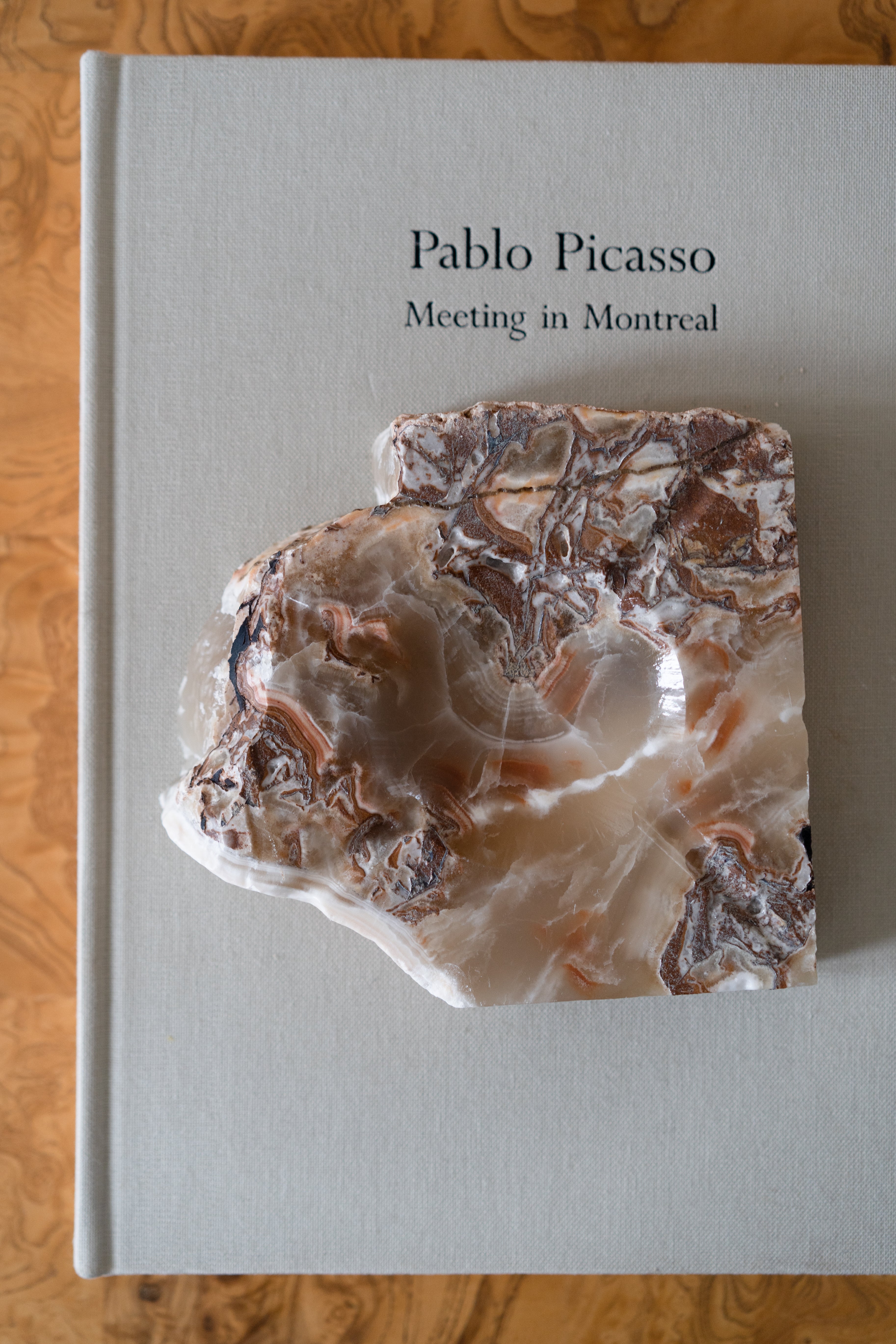 Vintage stone ashtray featuring raw edges, a blend of warm tones of honey, red, brown, and cream.