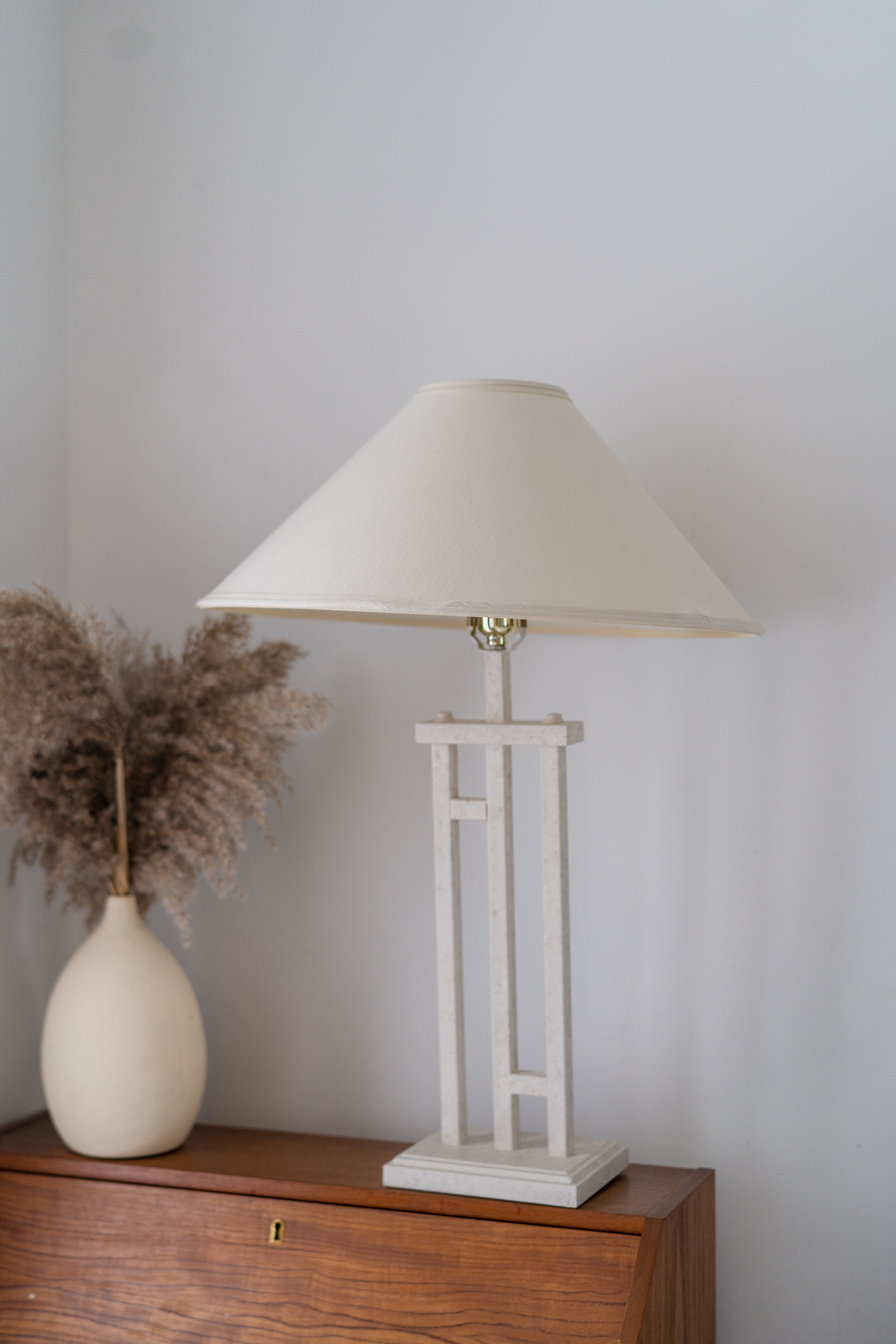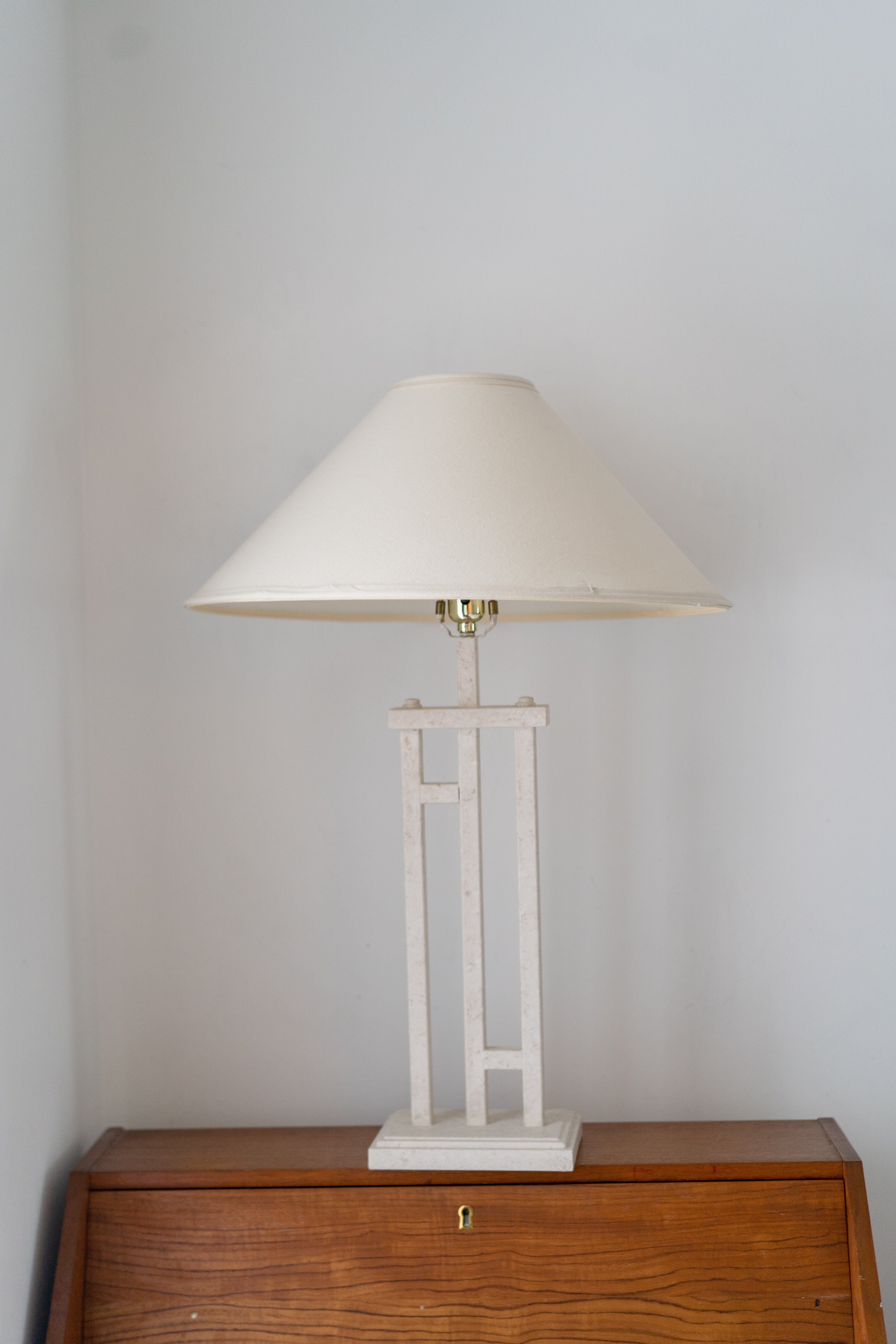 1980s postmodern lamp featuring metal tubular base in an eggshell, plaster-like finish. Shade included with purchase.