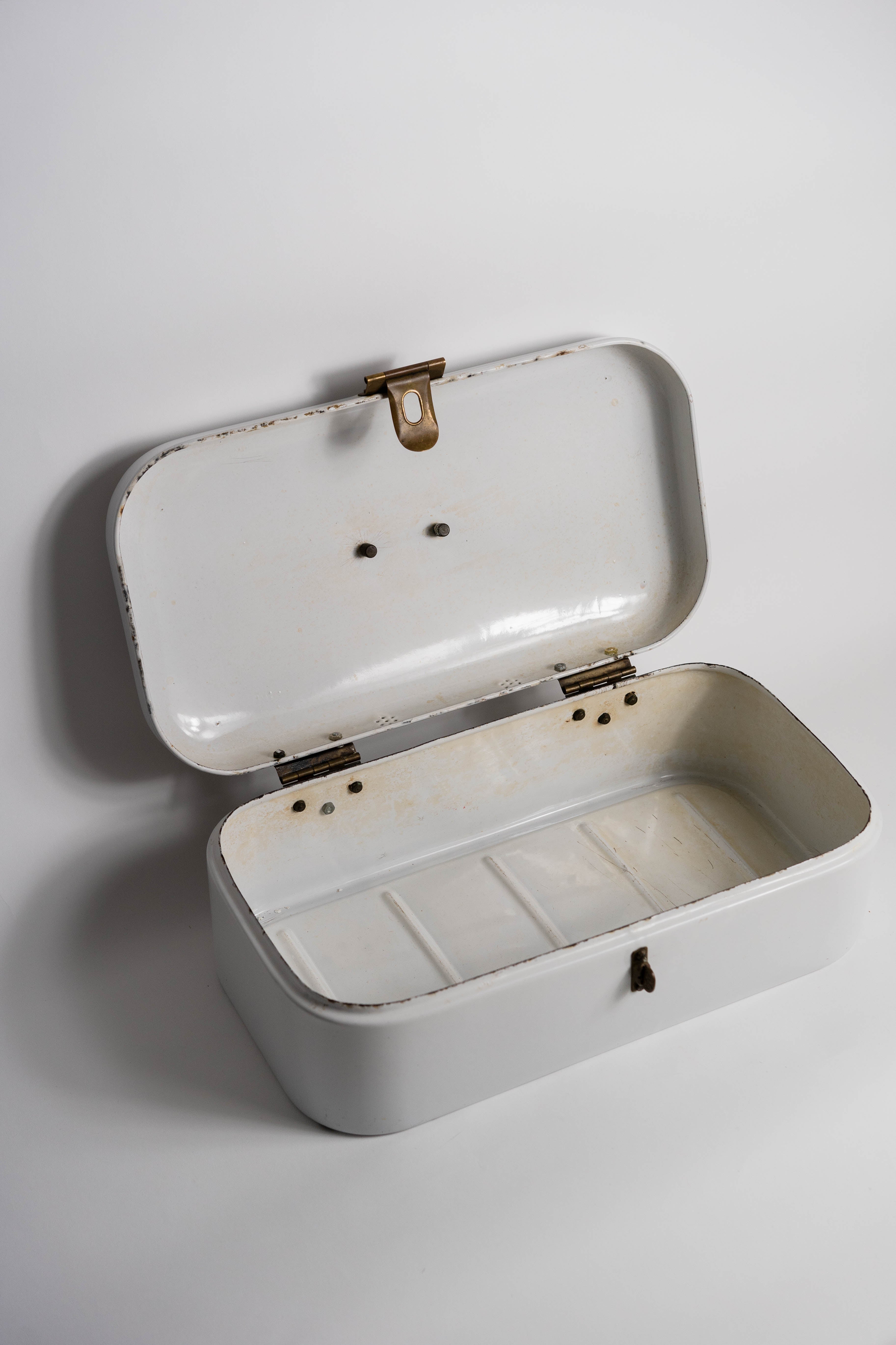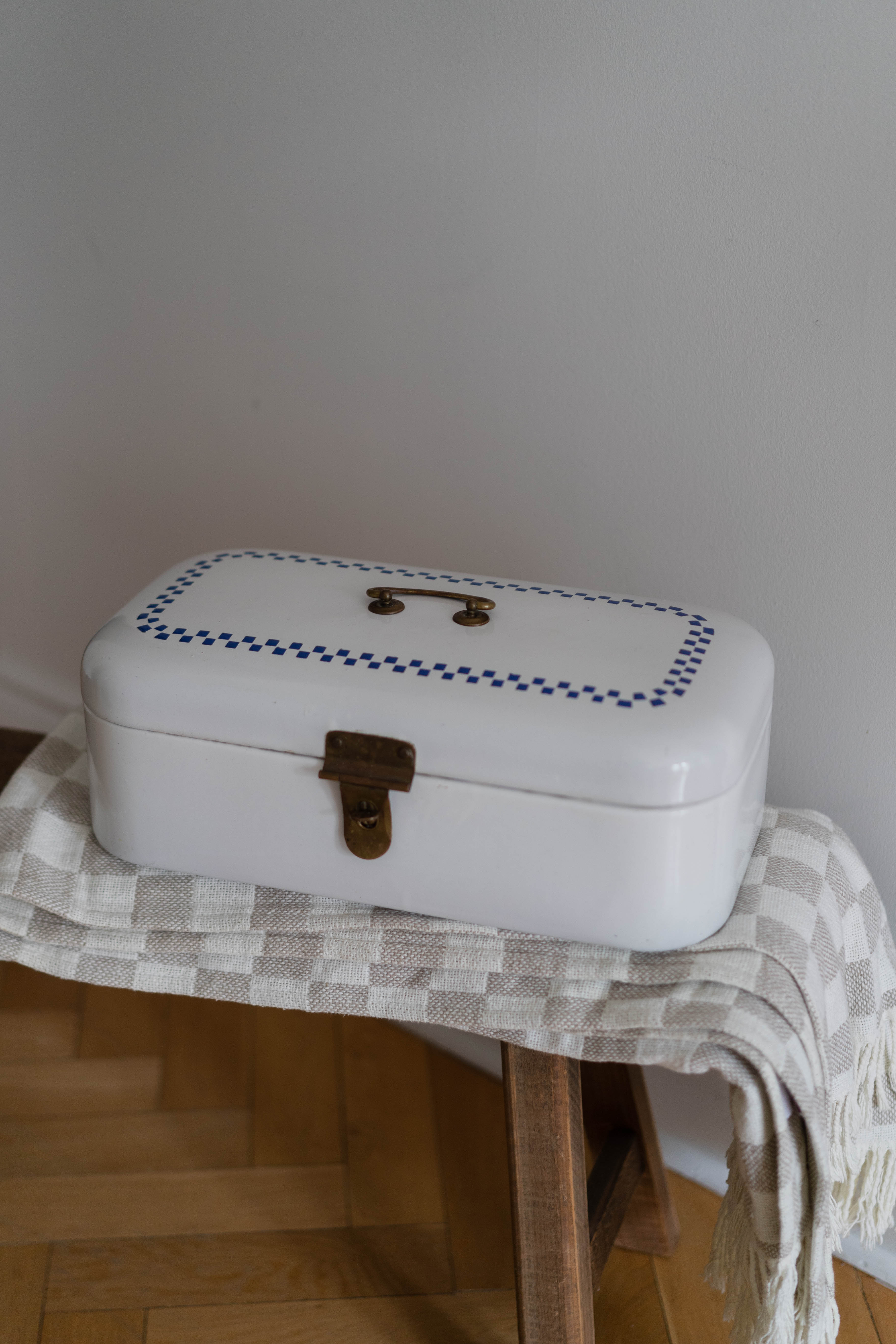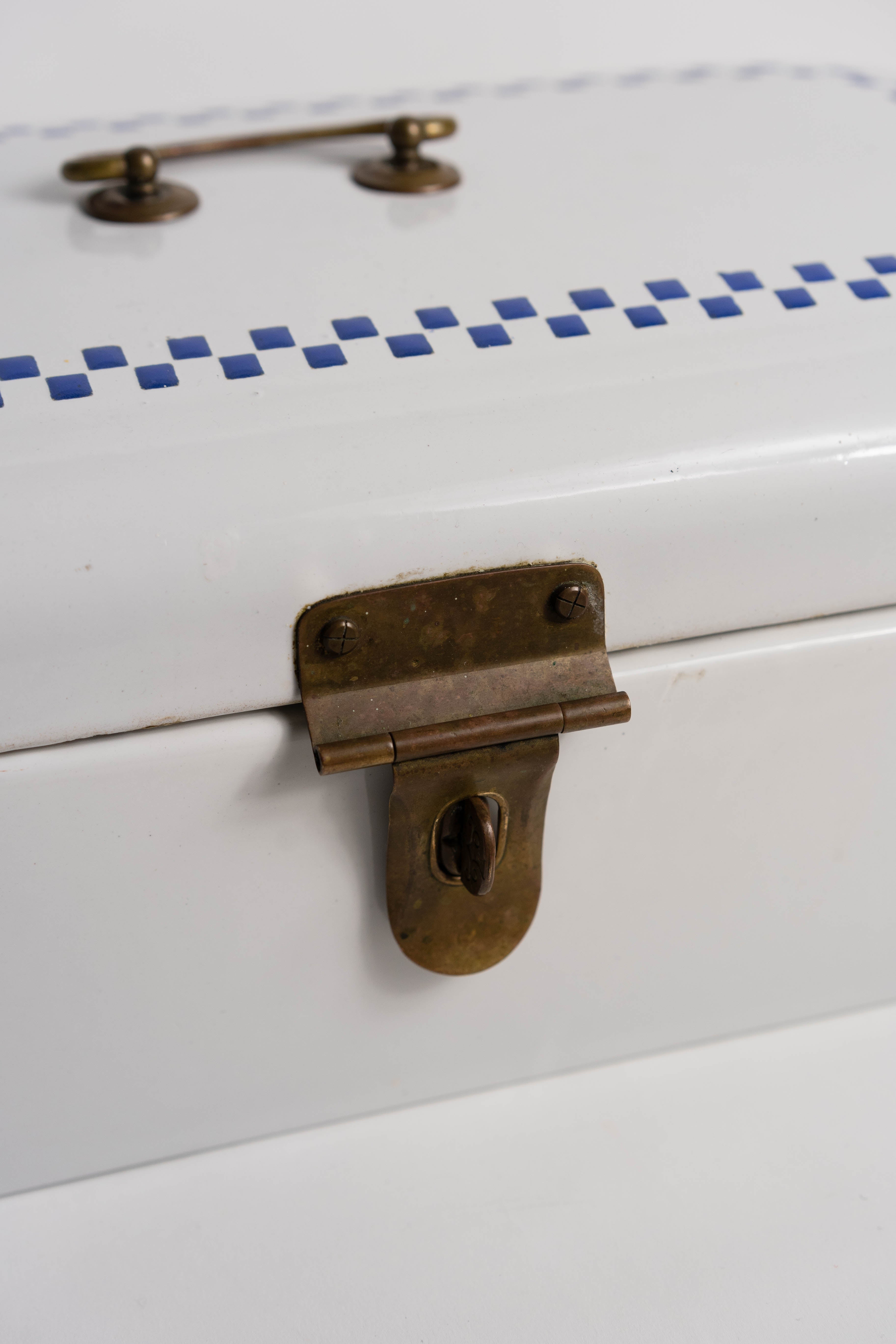 Vintage enamel bread box featuring a blue checker pattern, a brass lock and a top handle, c.1930s–1940s. Spacious and sturdy – perfect for storing bread, cookies, or pastries while adding a farmhouse charm to your kitchen décor.